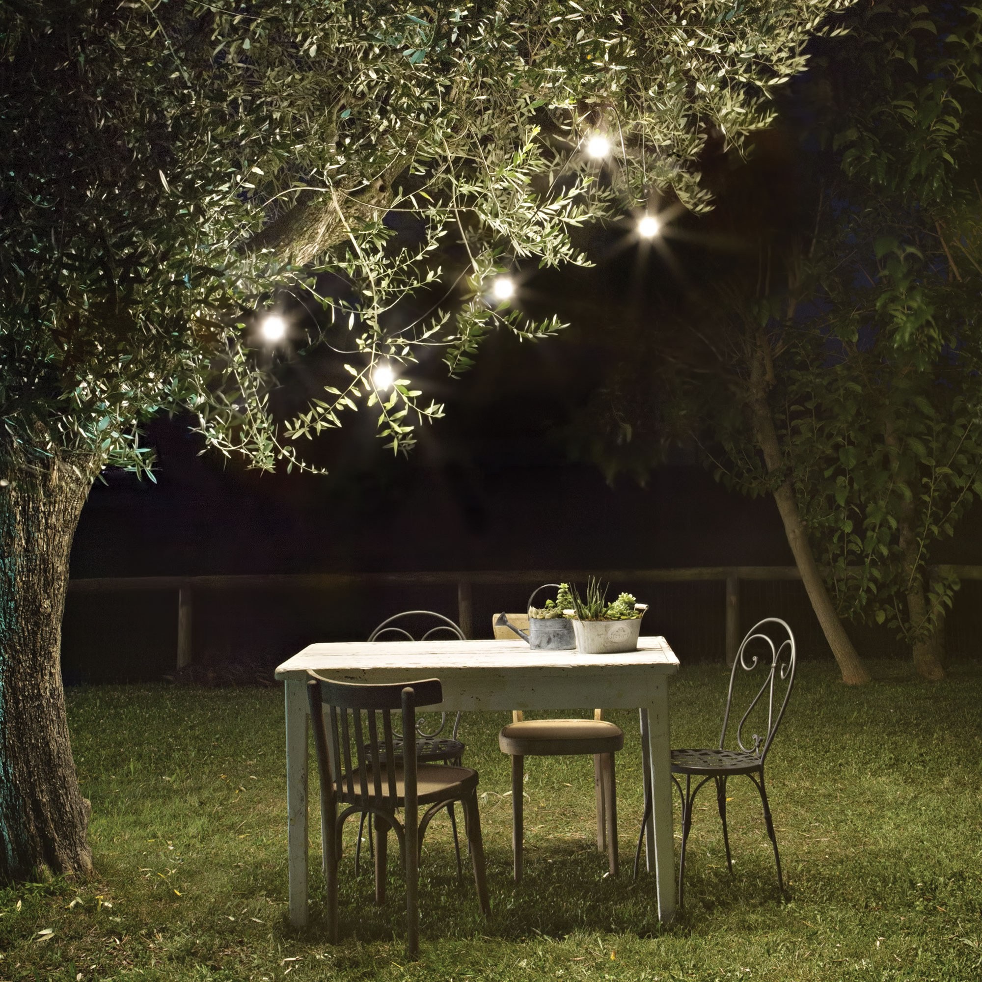 Cavo con portalampade e occhielli di ancoraggio in materiale plastico nero. Fornito con spina per esterni.