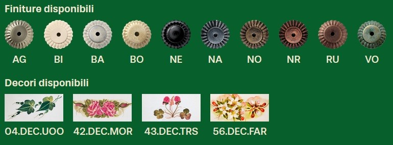 Finiture disponibili: SCEGLIERE LE FINITURE E I DECORI NELLA TABELLA IN ALLEGATO E SPECIFICARLI AL RIVENDITORE PRIMA DELL'ACQUISTO.