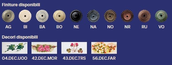 - Finiture disponibili: SCEGLIERE LE FINITURE E I DECORI NELLA TABELLA IN ALLEGATO E SPECIFICARLI AL RIVENDITORE PRIMA DELL'ACQUISTO.