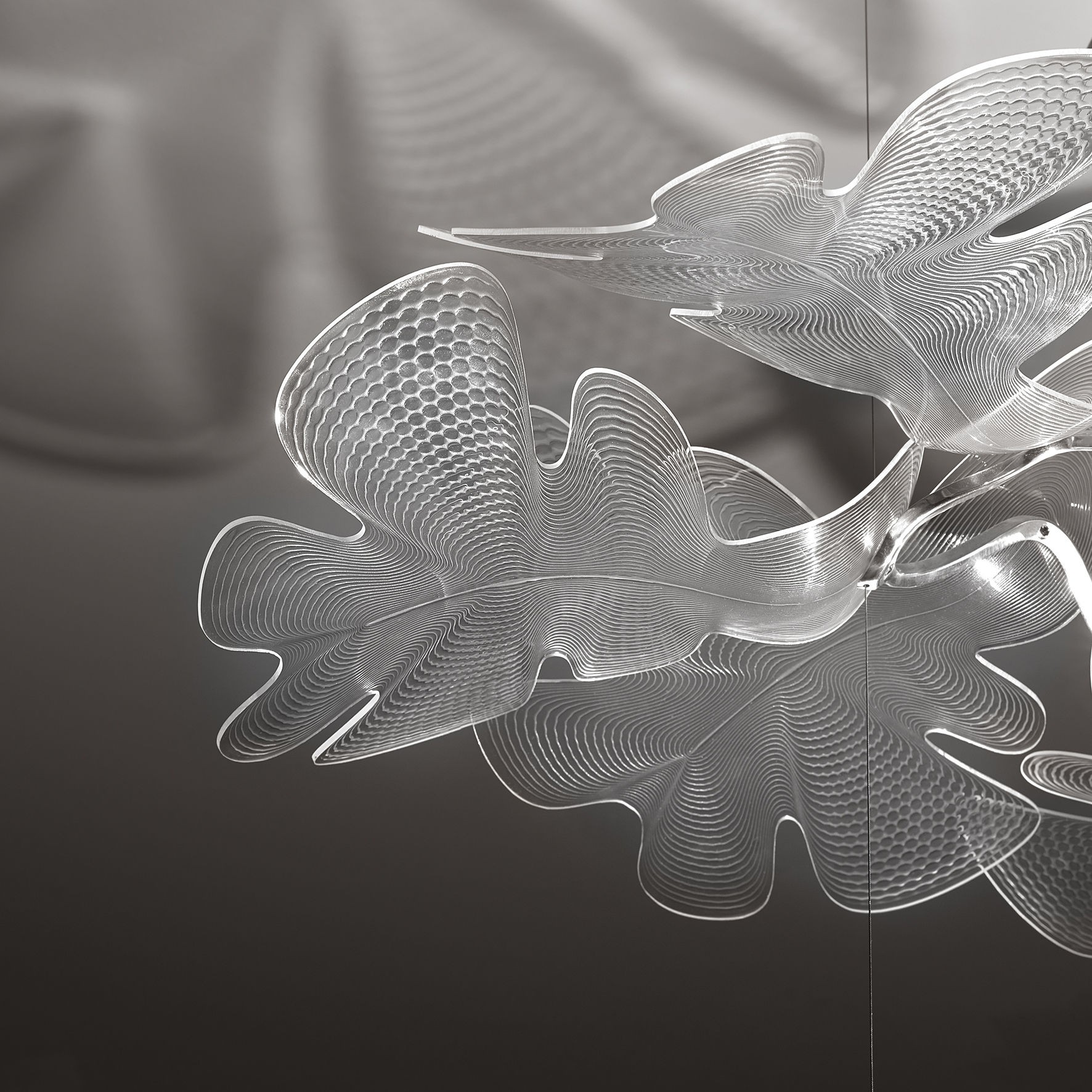 Chlorophilia è un nuovo progetto di Ross Lovegrove che ancora una volta interpreta la competenza artemide nel light engine del corpo luminoso con il suo segno caratteristico nelle forme organiche e fluide.E' una sospensione fortemente scenografica ma leggera che si completa quando accesa svela il gioco di delicate ombre che interagiscono con lo spazio.Si compone di un corpo che accoglie un LED COB fungendo da dissipatore e da leggeri elementi fitomorfici che, realizzati in pmma stampato, combinano al movimento della superficie con morbide onde una sezione discontinua che lavora otticamente come una lente.Il corpo centrale sospeso emette una luce indiretta che viene filtrata e rifratta da tre superfici trasparenti che con la loro forma naturale ricordano degli elementi naturali, delle foglie.Questi tre elementi disposti a raggiera si sovrappongono in parte per moltiplicare il gioco di ombre generando un effetto scenografico sul soffitto si combina però ad una corretta resa luminosa nell'ambiente.Chlorophilia definisce un principio ottico e compositivo che può essere ripetuto moltiplicandone gli elementi per creare composizioni che si sviluppano nello spazio su più livelli o si estendono in ampiezza.