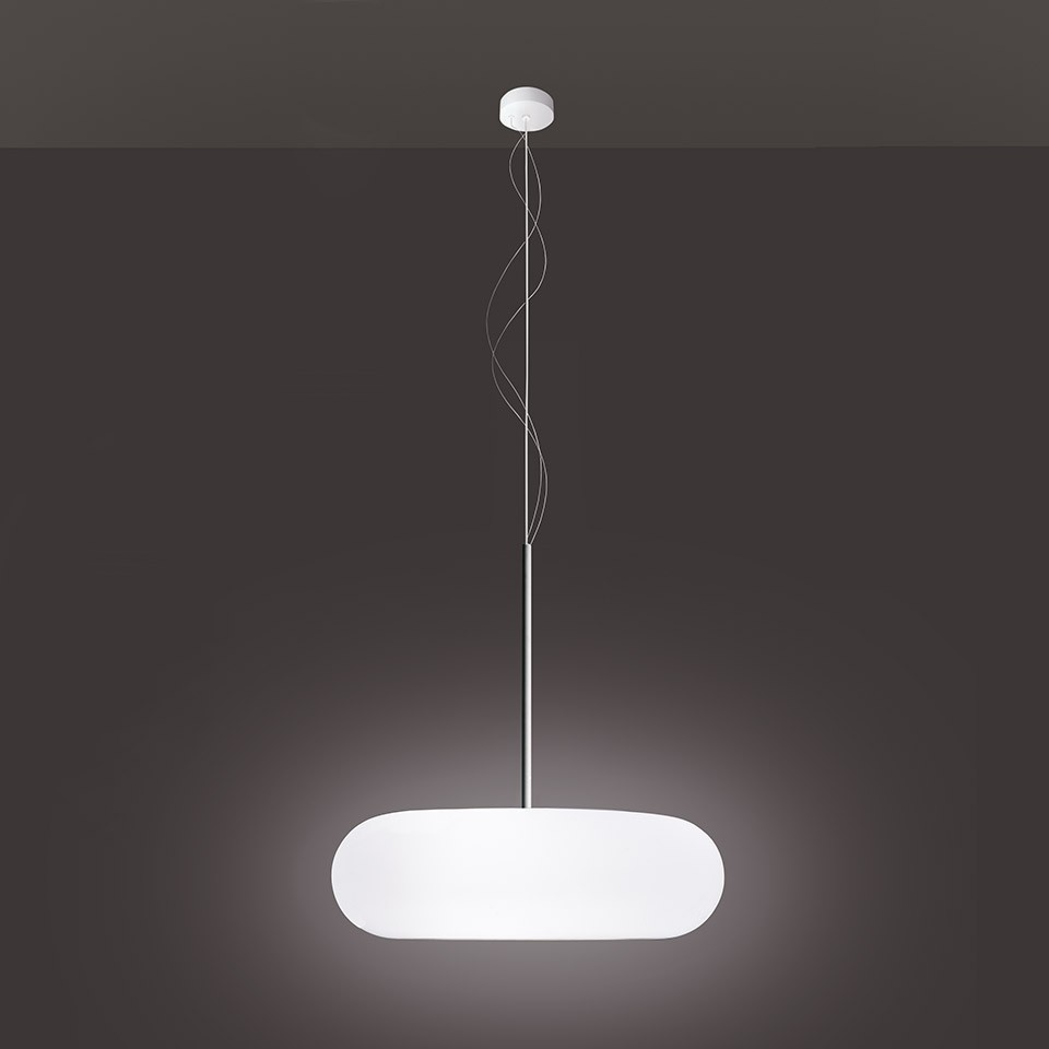 Itka Sospensione è una lampada in vetro opalino acidato satinato lavorato a mano. La struttura è in metallo verniciato bianco, ricoperta da pvc. Nonostante la forma schiacciata la distribuzione della luce è uniforme e non crea zone d’ombra sulla sua superficie.