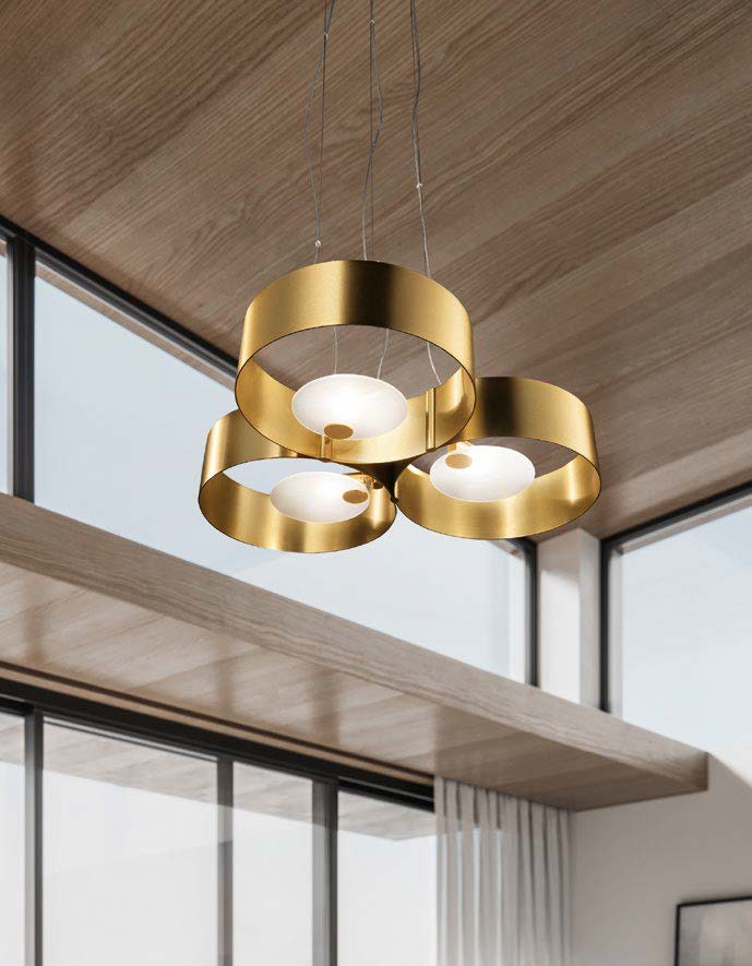 Struttura in metallo con finitura Oro spazzolato G12, oppure Ottone spazzolato + Nero opaco G18 + V90, diffusore in