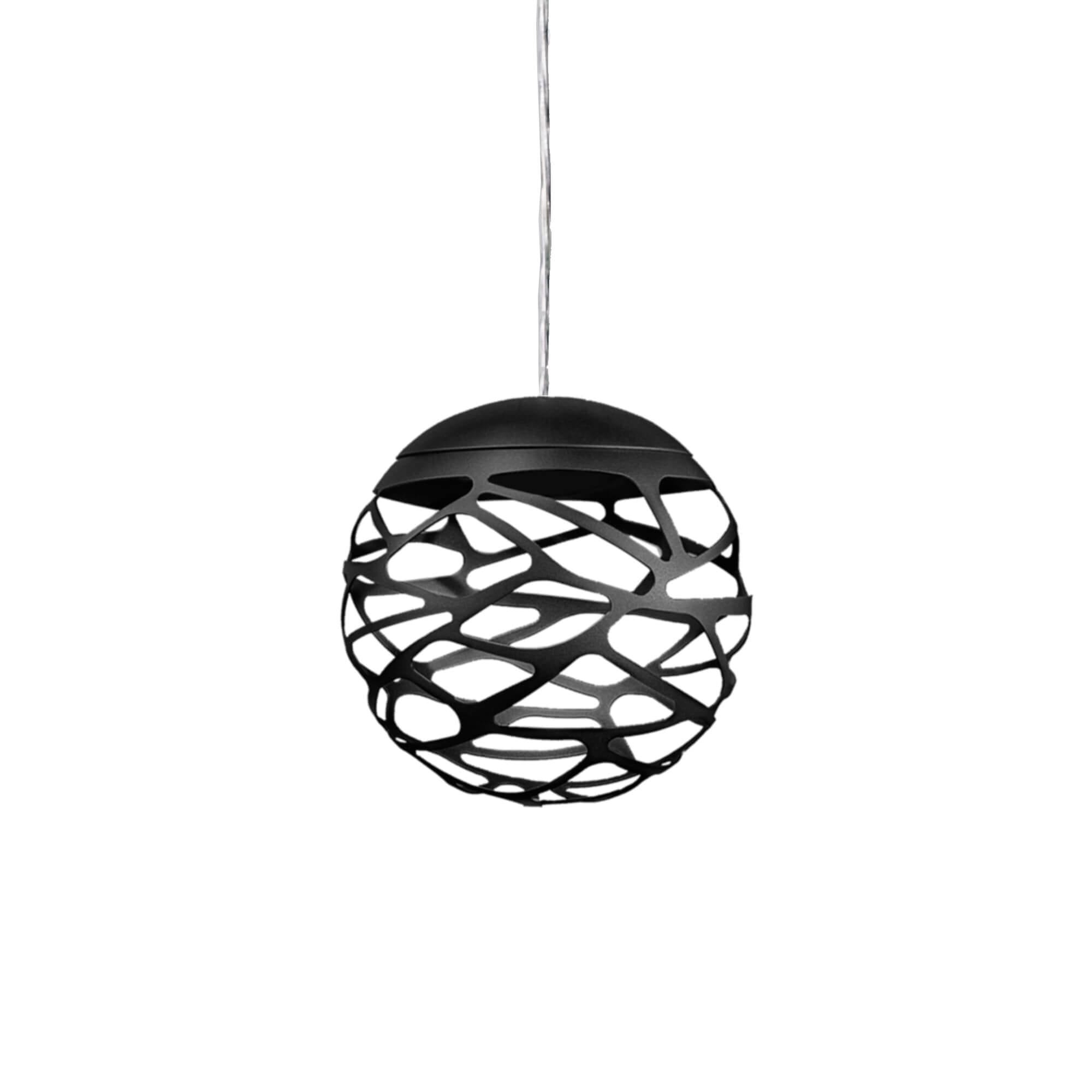 Kelly Cluster è una sfera metallica compatta del diametro di 18 cm che alloggia al suo interno un diffusore in vetro semitrasparente color bianco latte lucido. Diffusa in modo omogeneo, la luce esalta l’eleganza della lavorazione a laser, filtrando attraverso gli spazi vuoti. Sospesa ad un sottile cavo di alimentazione, lungo fino a 4 metri, sembra galleggiare nello spazio, diffondendo una luce calda emessa da un LED da 7 W. L’indice di resa cromatica (CRI) pari a 90 restituisce fedelmente il colore naturale degli oggetti.