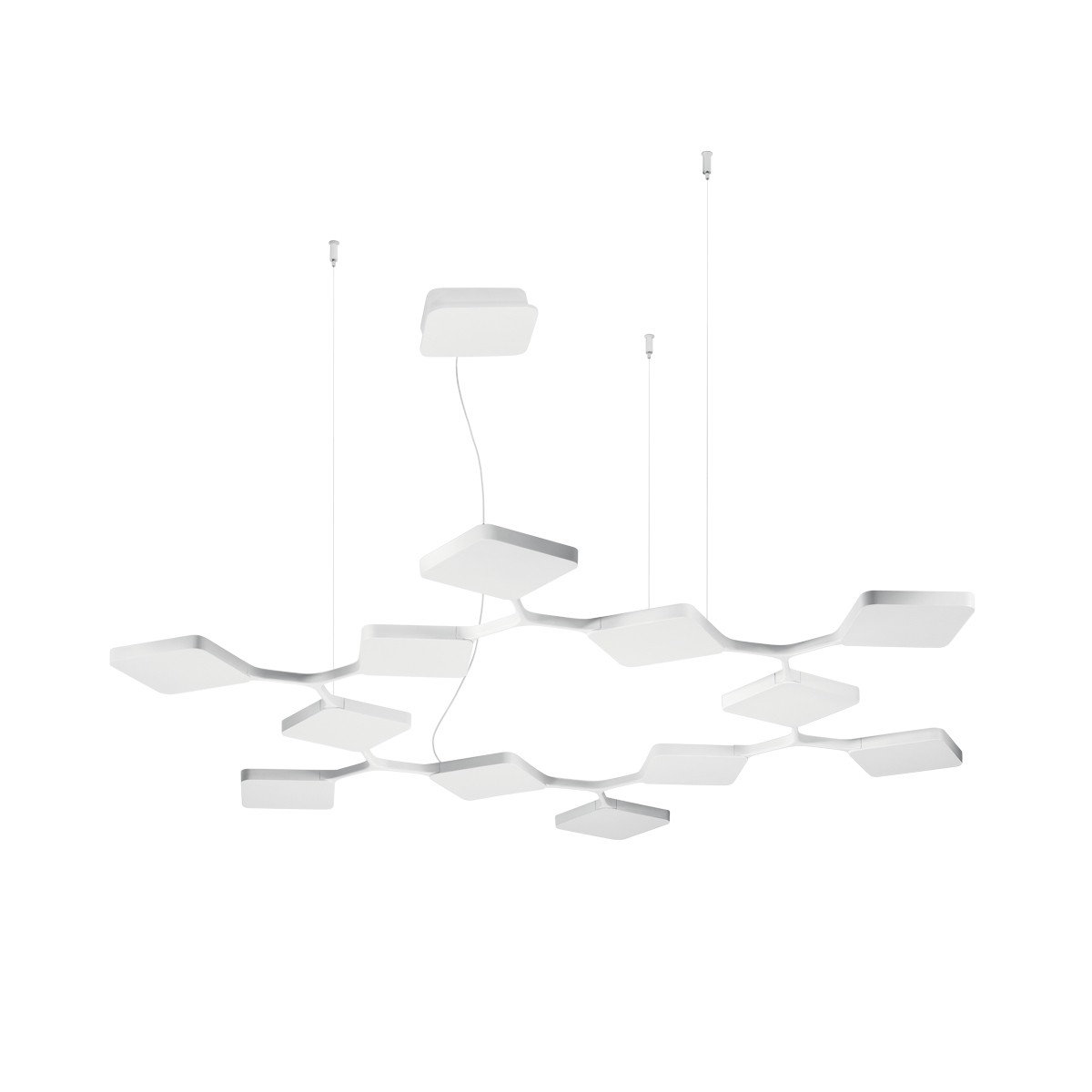 Quad è una collezione di sospensioni composte dalla connessione di più moduli quadrati, che emettono una luce indiretta o a doppia emissione, che si diffonde morbidamente nello spazio. Con il suo design articolato crea suggestive atmosfere.