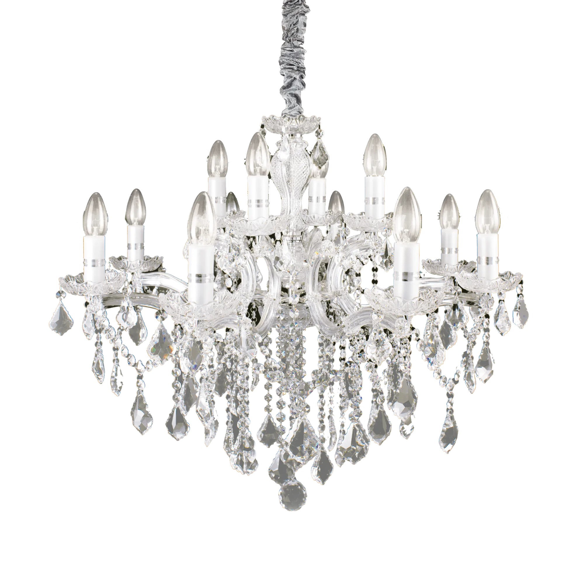 Montatura in metallo con elementi decorativi in vetro. Pendagli con ottagoni e gocce finali in cristallo molato. Disponibile nelle versioni con vetro trasparente e metallo dorato o cromato.