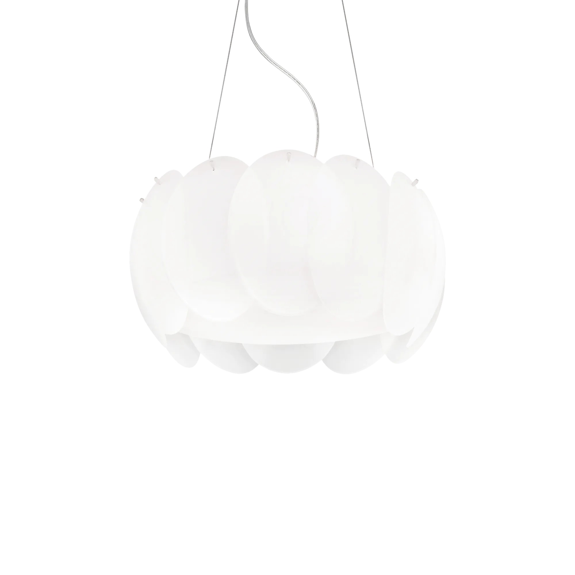 Diffusore composto da elementi circolari in lastra di vetro curvata e acidata. Cavi in acciaio regolabili in lunghezza da dispositivi automatici.