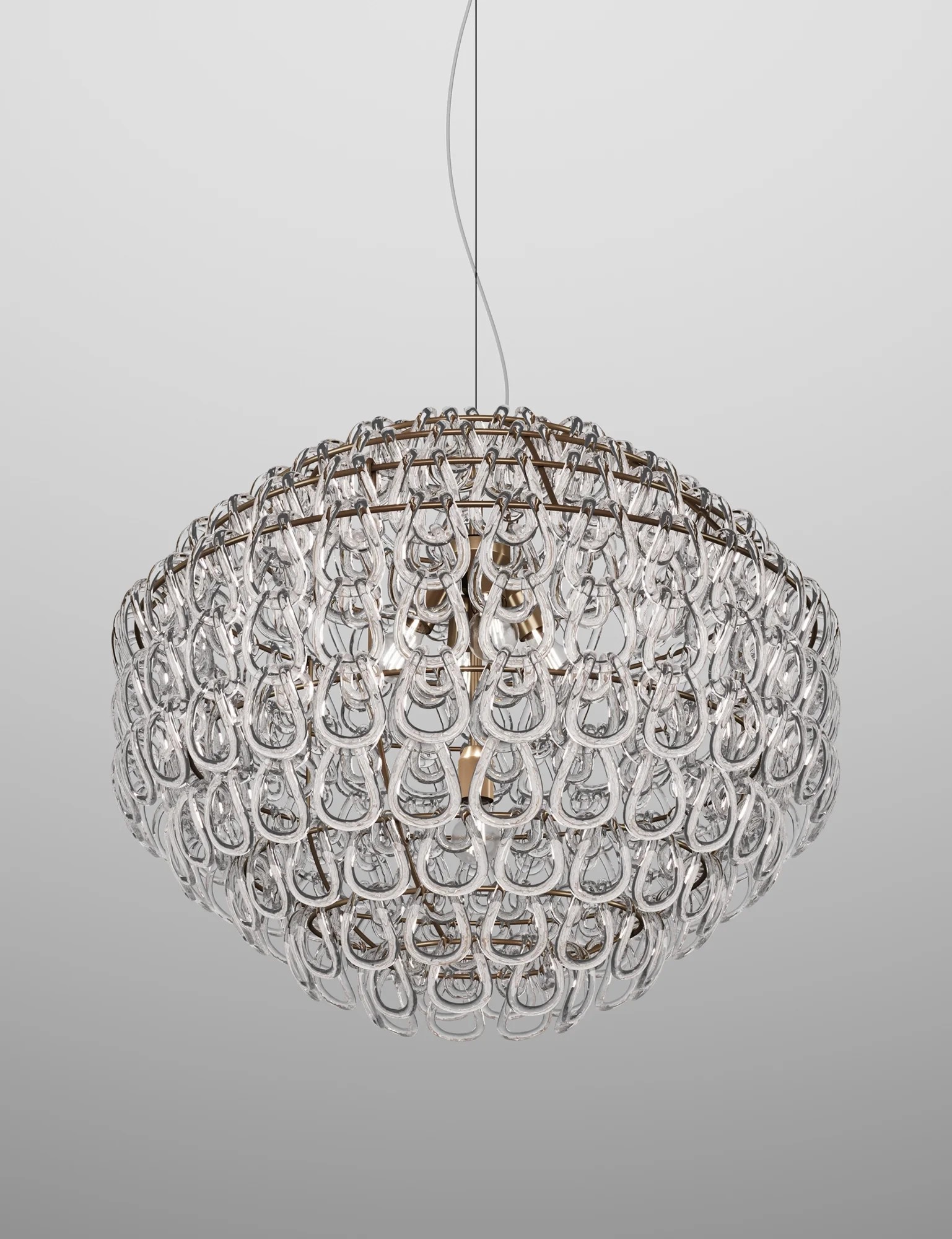 Un elemento, puro: il gancio di cristallo. È l’intuizione di un Maestro del design italiano come Angelo Mangiarotti che, nel 1967, dà origine al best seller del catalogo Vistosi, Giogali. Un intreccio iconico applicato alla versione che si preferisce.