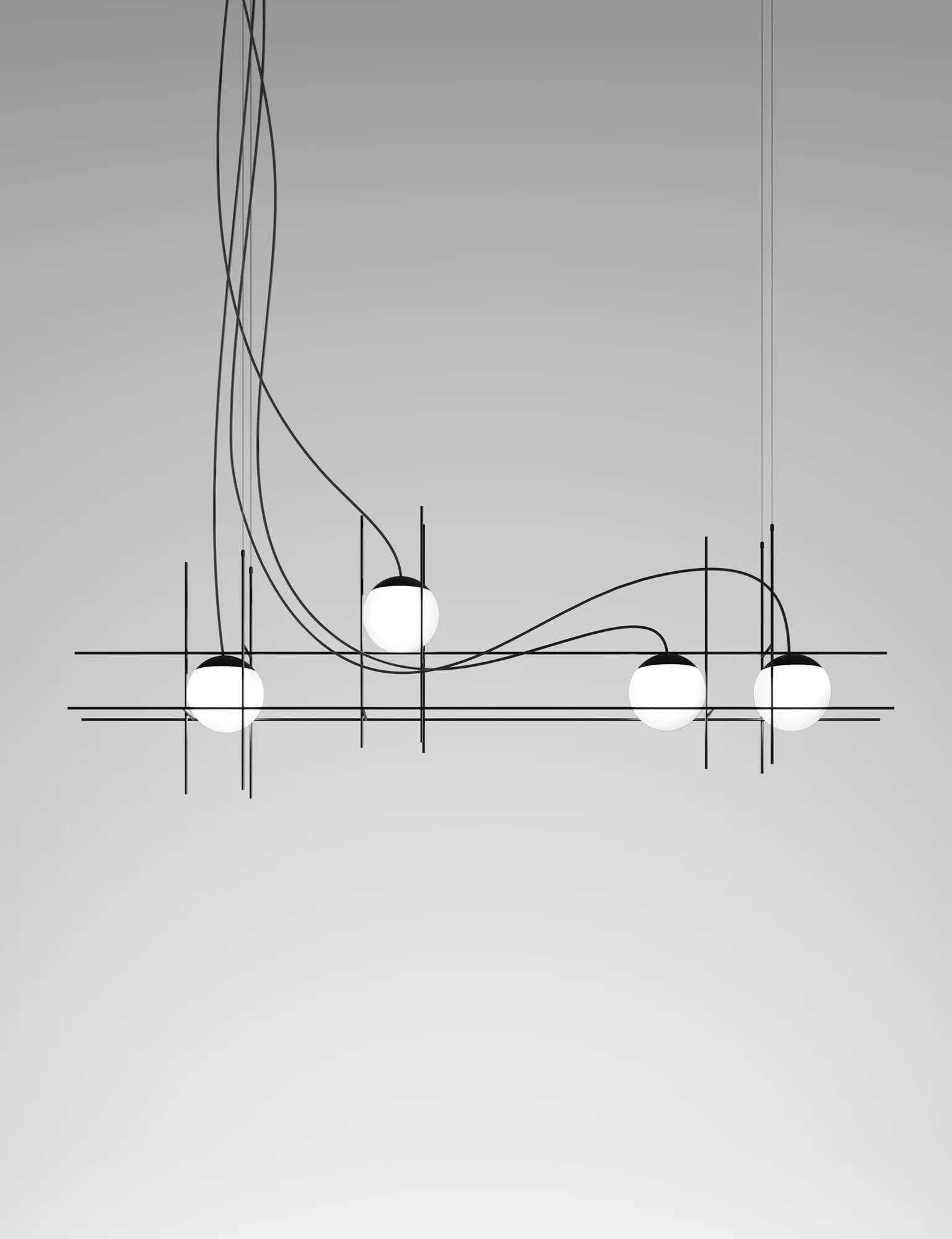 L’ispirazione dalla quale nasce la linea Plot Frame è la semplicità della sfera e il tentativo di rappresentarne il movimento. Una trama metallica all’interno della quale sfere di vetro luminescenti sono quasi libere di muoversi consentendo al fruitore di interagire con l’oggetto. Montatura nera opaca. Sorgente luminosa LED.
