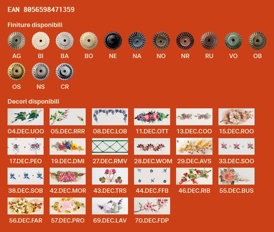 - Finiture disponibili: SCEGLIERE LE FINITURE E I DECORI NELLA TABELLA IN ALLEGATO E SPECIFICARLI AL RIVENDITORE PRIMA DELL'ACQUISTO.