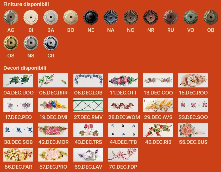 - Finiture disponibili: SCEGLIERE LE FINITURE E I DECORI NELLA TABELLA IN ALLEGATO E SPECIFICARLI AL RIVENDITORE PRIMA DELL'ACQUISTO.