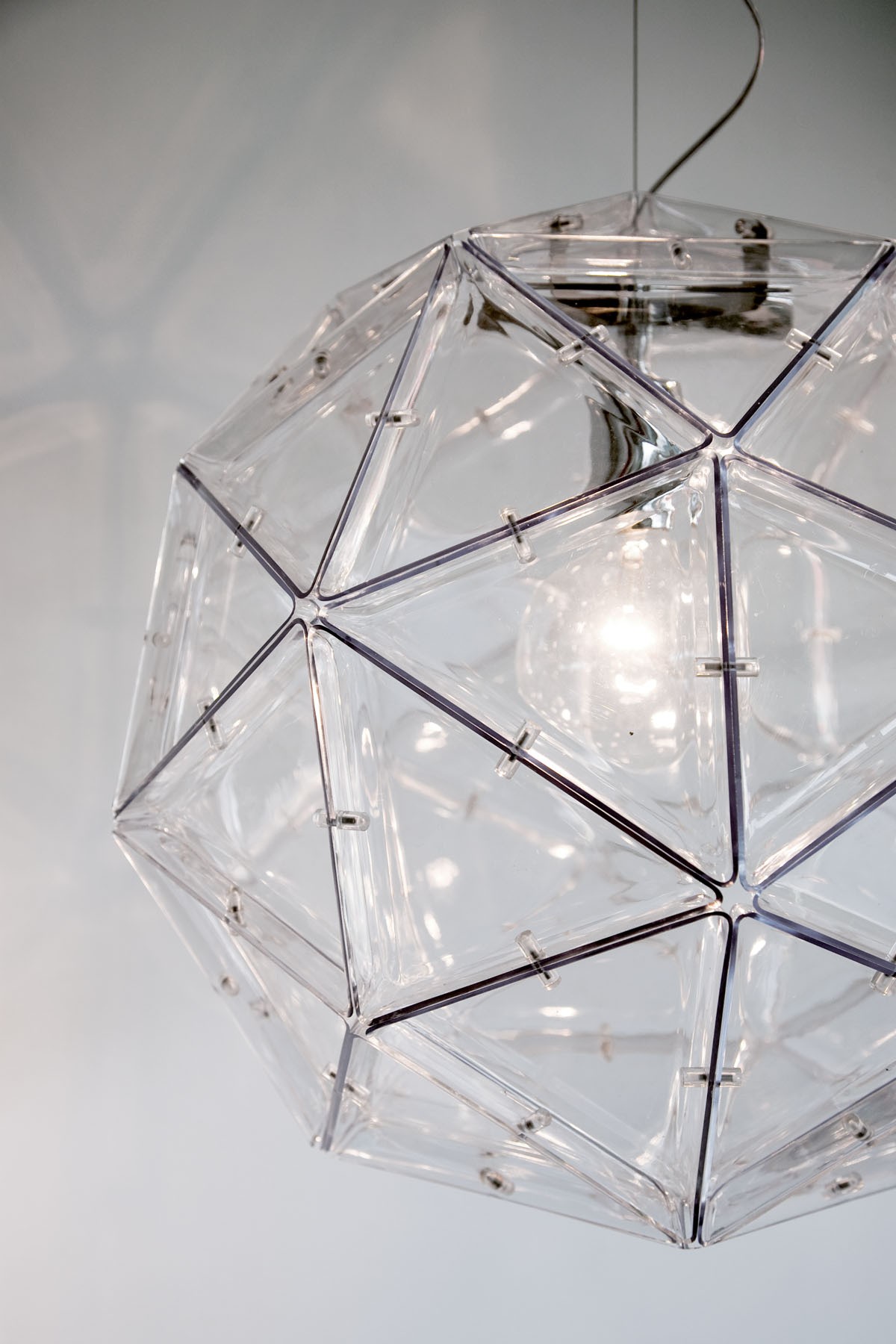 Un unico elemento triangolare in policarbonato trasparente che si ripete sessanta volte, assemblato con piccoli pomelli, va a formare la struttura della lampada.