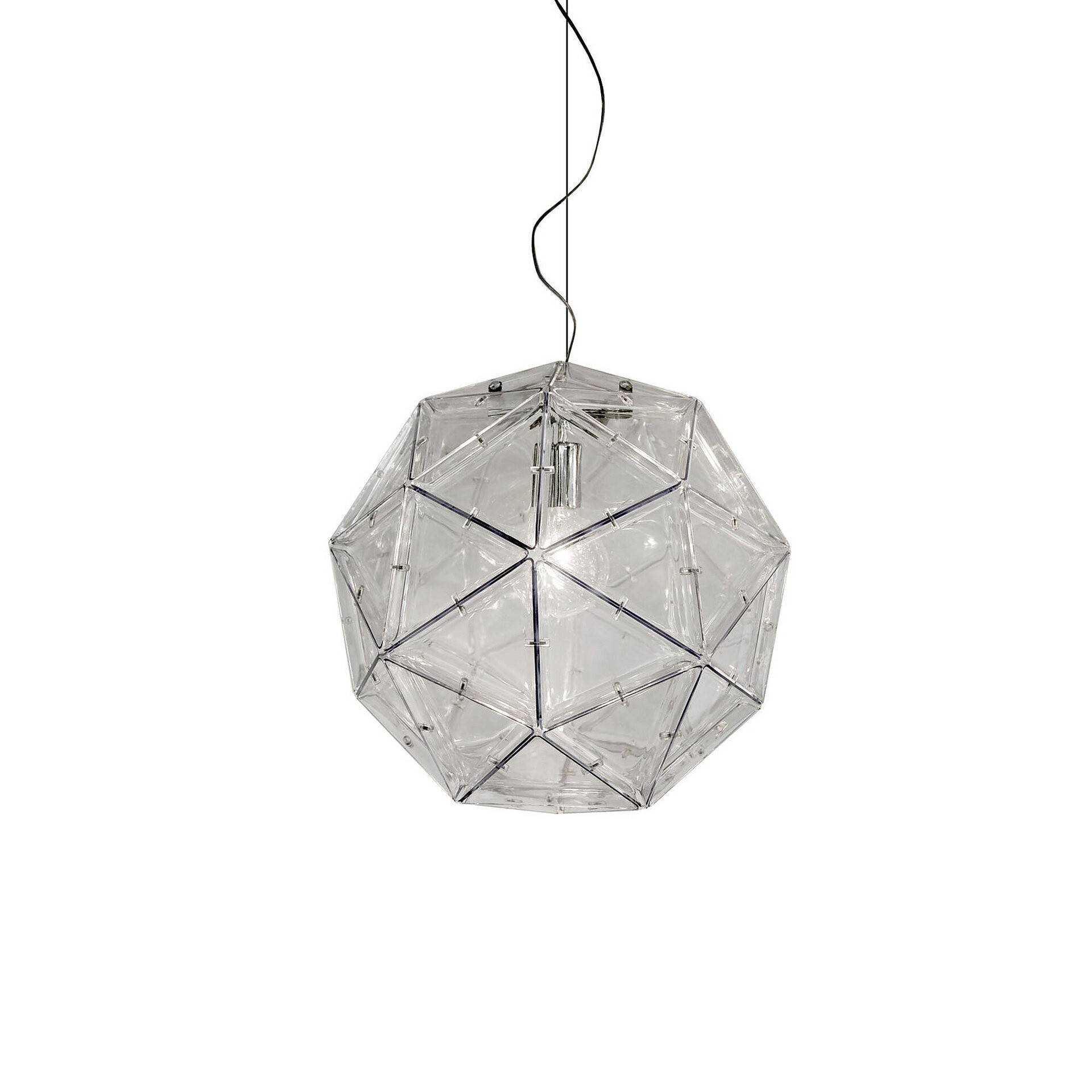 Lampada a sospensione a luce diffusa, sospesa con cavo in acciaio. Struttura di attacco in metallo cromato. Diffusore formato da sessanta moduli uguali a triangolo, stampati in policarbonato trasparente, fissati tra di loro con pomelli a vite trasparenti. Per lampadina a Led.