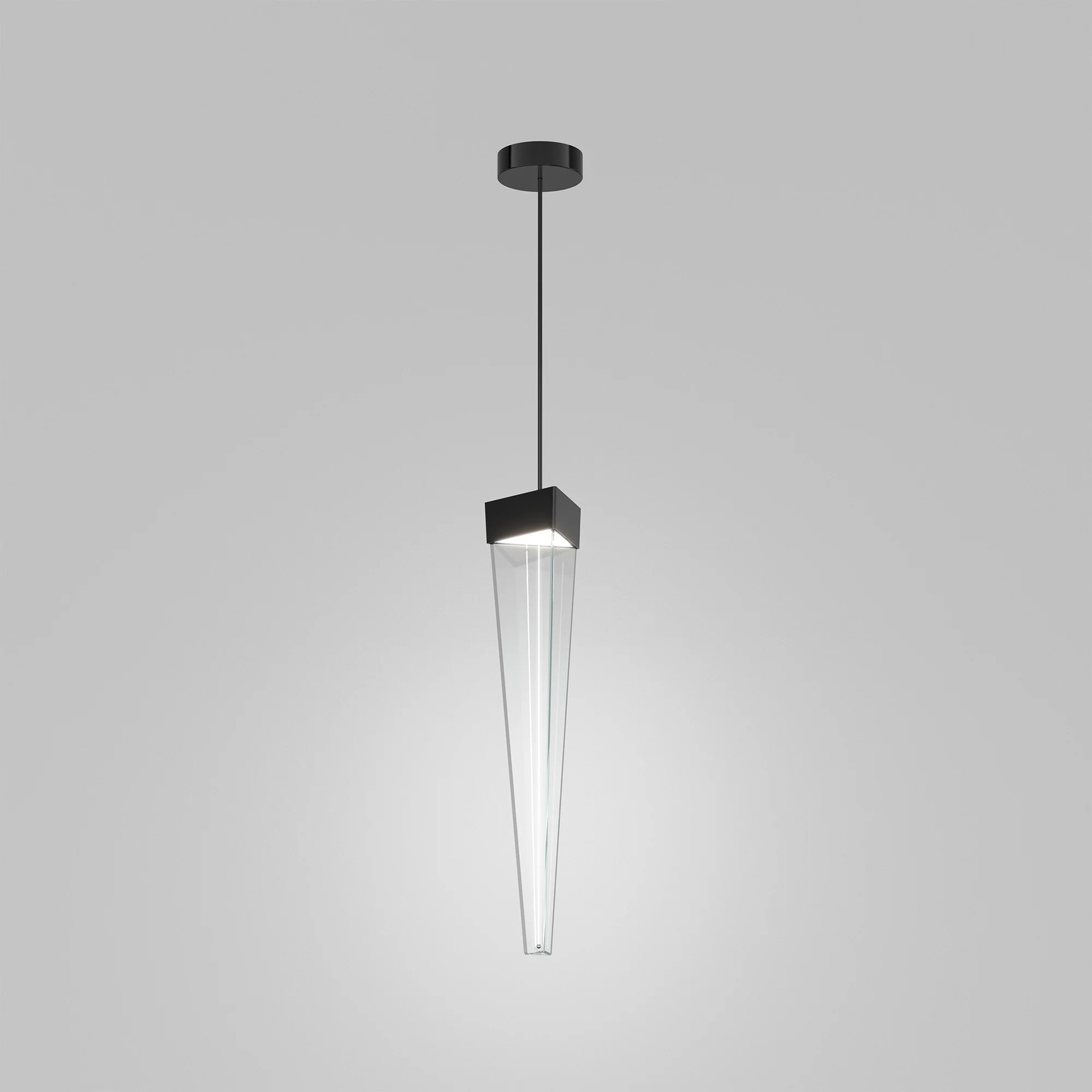 Stalactite è una lampada a sospensione caratterizzata da un diffusore di forma piramidale a base triangolare in vetro lastra (trasparente, ambra, ametista, bluino o fumé). La struttura in metallo con finitura nickel nero lucido valorizza la brillantezza del vetro e conferisce alla lampada un’estetica elegante e contemporanea. La lampada integra una doppia sorgente luminosa: la luce principale è situata sotto il supporto metallico, mentre la seconda sorgente è costituita da un filamento luminoso verticale che percorre tutta l’altezza del diffusore ed è mantenuto in tensione grazie a un piccolo magnete. La lampada funziona con tecnologia LED a 2700 K e con dimmazione TRIAC. Stalactite è destinata esclusivamente all’uso interno (IP20) e viene fornita con rosone e cavo nero inclusi. La verticalità del corpo illuminante e il filamento interno generano un effetto scenografico e suggestivo, ideale per zone living, lounge, sale da pranzo, reception e progetti hospitality.