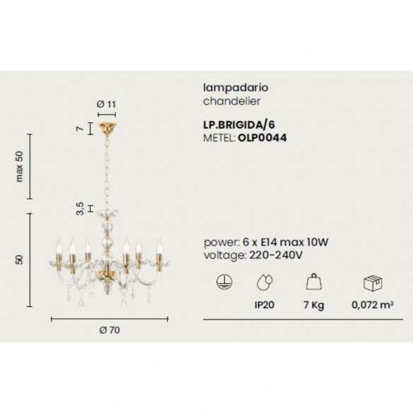 - Attacco: 6 x LED E14, max 10 W.