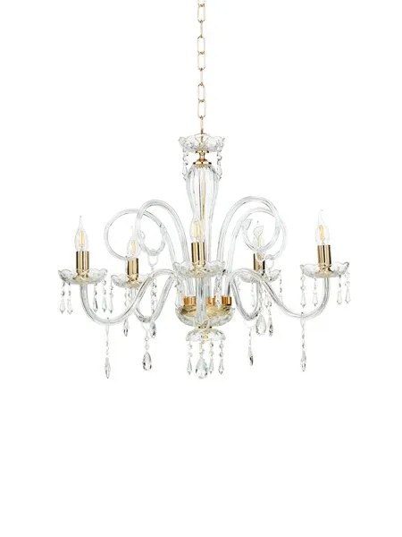Sospensione in vetro soffiato fatto a mano, con finiture oro e cristalli trasparenti.