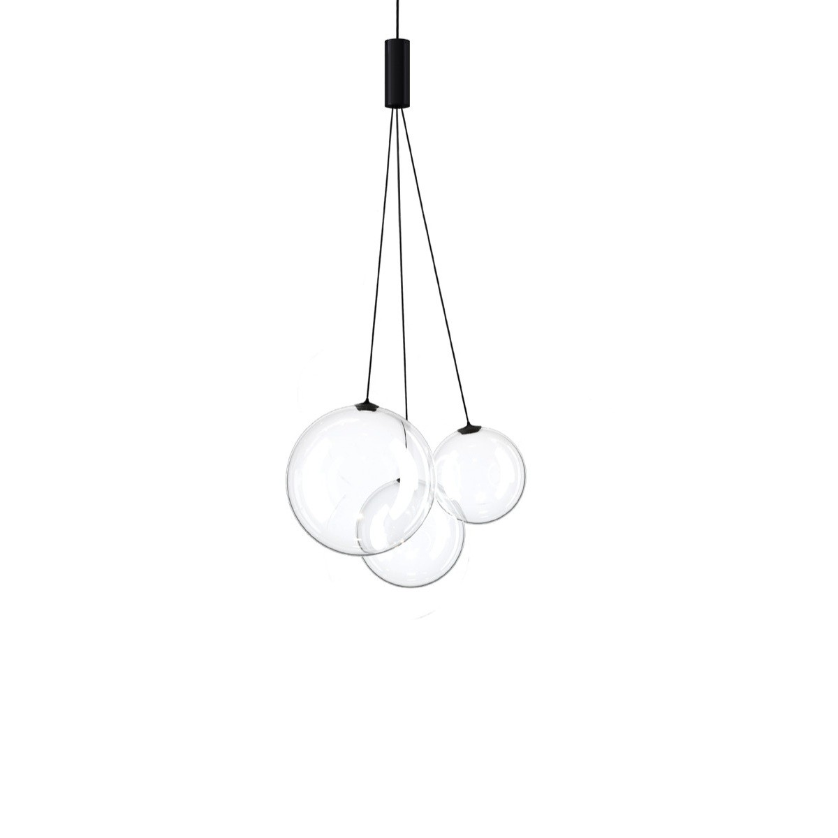 Leggerissima lampada a sospensione in vetro soffiato, Random è composta da tre diffusori sferici di dimensioni diverse che formano un’entità semplice e vivace. Ogni diffusore è dotato di una sorgente luminosa a LED che fornisce una luce calda.