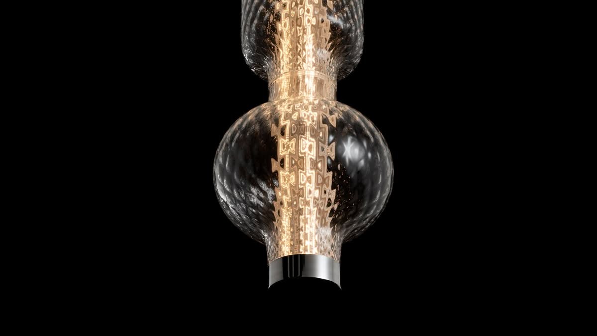 Alambicco è un corpo illuminante modulare che esalta la bellezza del vetro soffiato, giocando con trasparenze e texture per modulare e diffondere la luce. Al centro si trova una struttura in alluminio estruso che ospita i circuiti LED su quattro facce opposte: è il cuore tecnologico attorno a cui si sviluppano i vari strati. Il primo strato è un cilindro in vetro zigrinato, pensato per rifrangere la vista degli elementi tecnologici senza nasconderli del tutto, garantendo un’emissione luminosa priva di abbagliamento.