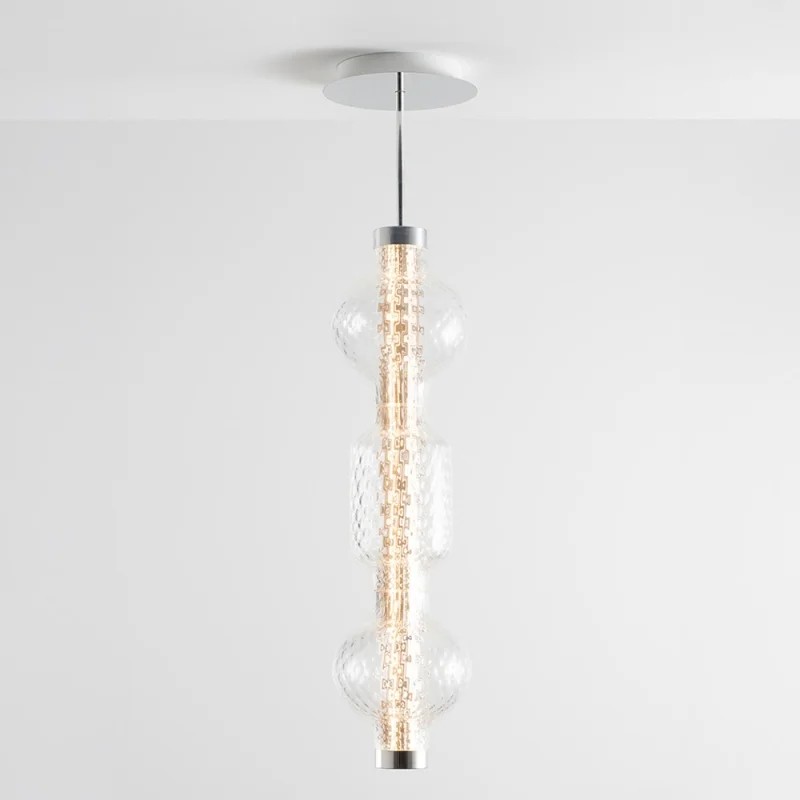 Alambicco è un corpo illuminante modulare che esalta la bellezza del vetro soffiato, giocando con trasparenze e texture per modulare e diffondere la luce. Al centro si trova una struttura in alluminio estruso che ospita i circuiti LED su quattro facce opposte: è il cuore tecnologico attorno a cui si sviluppano i vari strati. Il primo strato è un cilindro in vetro zigrinato, pensato per rifrangere la vista degli elementi tecnologici senza nasconderli del tutto, garantendo un’emissione luminosa priva di abbagliamento.