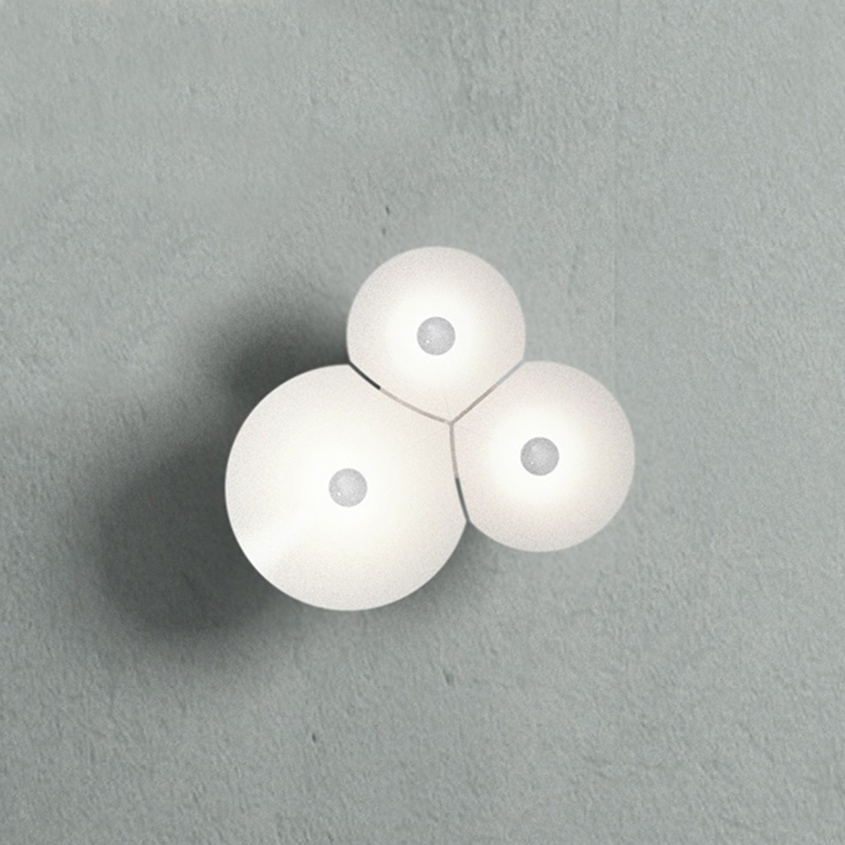 Una serie di parabole di varie dimensioni s’intersecano generando la caratteristica geometria delle bolle di sapone; si tratta di forme coniche, ampie e piatte, ognuna delle quali è costituita da una sagoma in policarbonato bianco che, piegandosi leggermente, assume una natura strutturale. Alcentro di ciascuna bolla si accende la sorgente luminosa: essa racchiude l’anima della lampada e diffonde, grazie ai LED integrati dimmerabili, una luce gradevole e morbida che si riflette verso l’interno del cono.