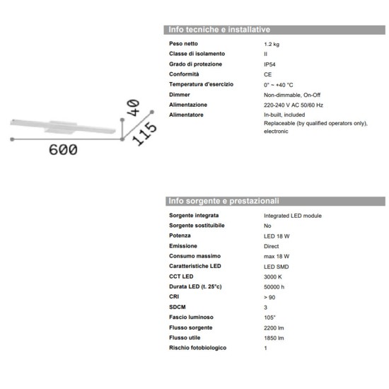 - Attacco: 1 x LED 18 W, 2200 lumen, 3000K.