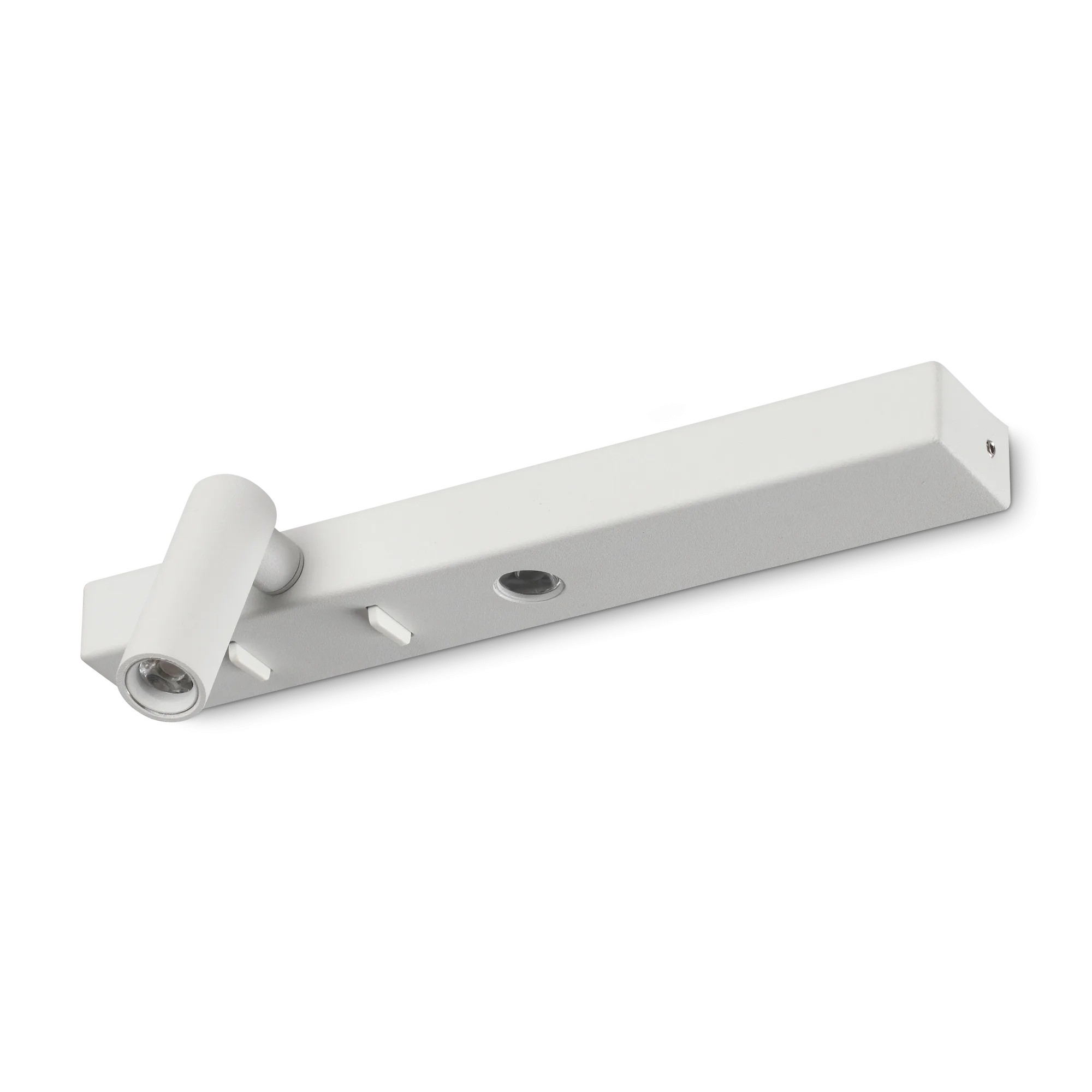 Montatura in metallo placcato o verniciato a polveri. Doppia sorgente: una fissa e una su cilindro orientabile. Due interruttori integrati per accensioni indipendenti. Colori: bianco, nero, ottone.