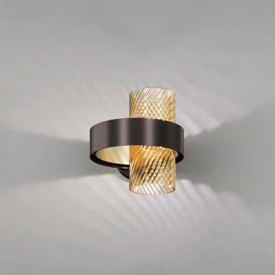 La collezione presenta vetri di colori caldi e freddi (cristallo e ambra, fumè e ambra), o l'estrema trasparenza del puro cristallo, in due diverse finiture metalliche: nickel nero satinato e oro satinato.