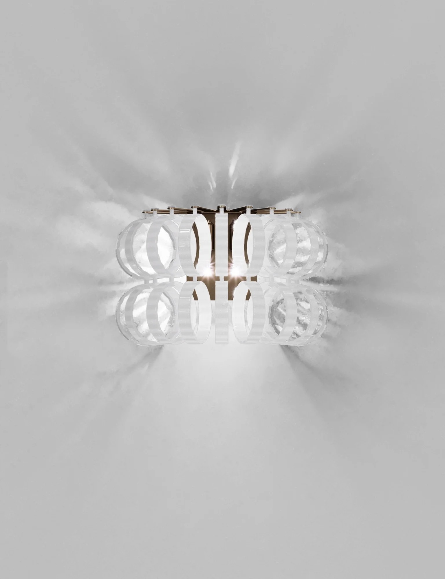 La matrice da cui nasce l’idea della collezione Ecos è una sola: l’anello di vetro. Estremamente personalizzabile in termini di forme e misure, per un’illuminazione davvero originale. Tonalità del vetro bianco o cristallo con lavorazione rigadin. Parti metalliche in finitura bronzo satinato e cromo.