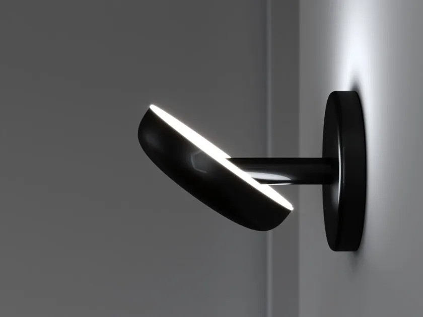Lampada da parete a luce diretta con riflettore orientabile. Struttura in pressofusione di alluminio verniciato. Diffusore in metacrilato bianco. Sorgente di luce a LED e alimentatore integrati.