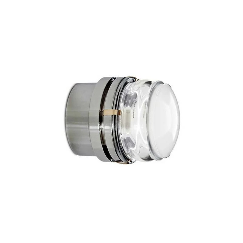 Lampada da parete o soffitto versione solo per interno a luce diretta e diffusa. Fusione in metallo cromato e diffusore in lente Fresnel.