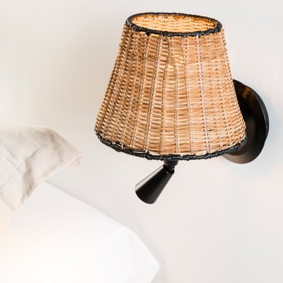 Sumba è una collezione per l’illuminazione di spazi interni creata da Faro Lab, con il rattan come protagonista. Questa lampada da parete nera con lettore e con paralume rattan è pensata per l’illuminazione di camere da letto e saloni. Rappresenta una buona opzione per gli hotel.