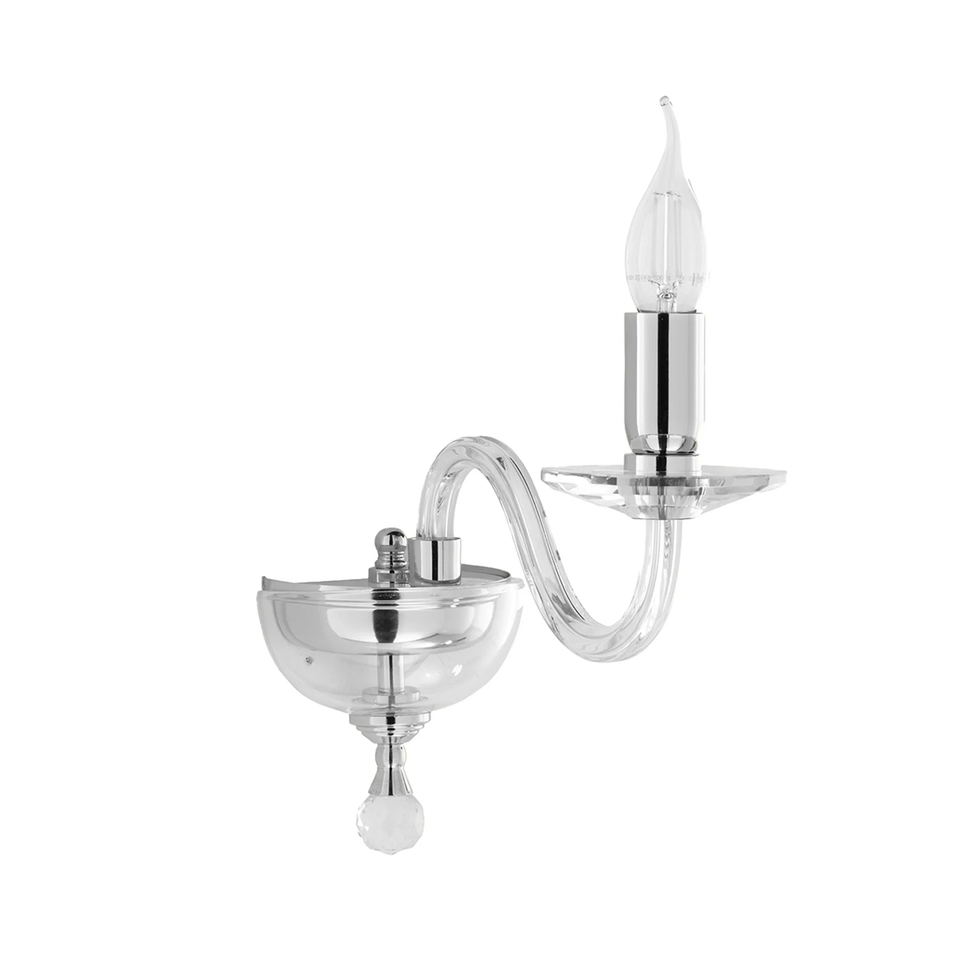 Lampada da parete con singolo braccio in vetro fatto a mano. Dettagli in cristallo ottico. Finiture in metallo. Disponibile in quattro colori: Cristallo, Oro, Ambra, Borgogna.