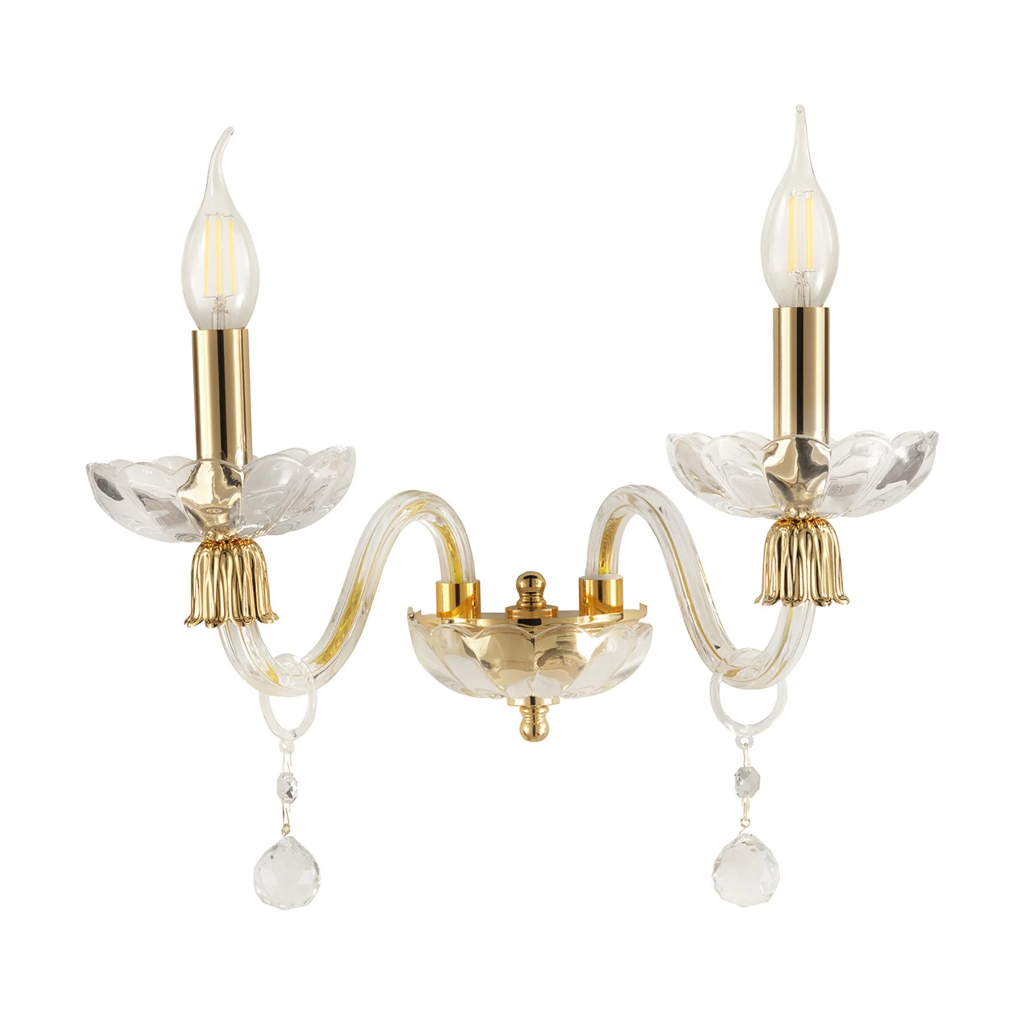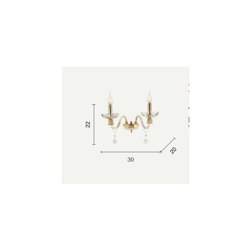 Lampada da parete con doppio braccio in vetro soffiato fatto a mano. Particolari in finitura oro.