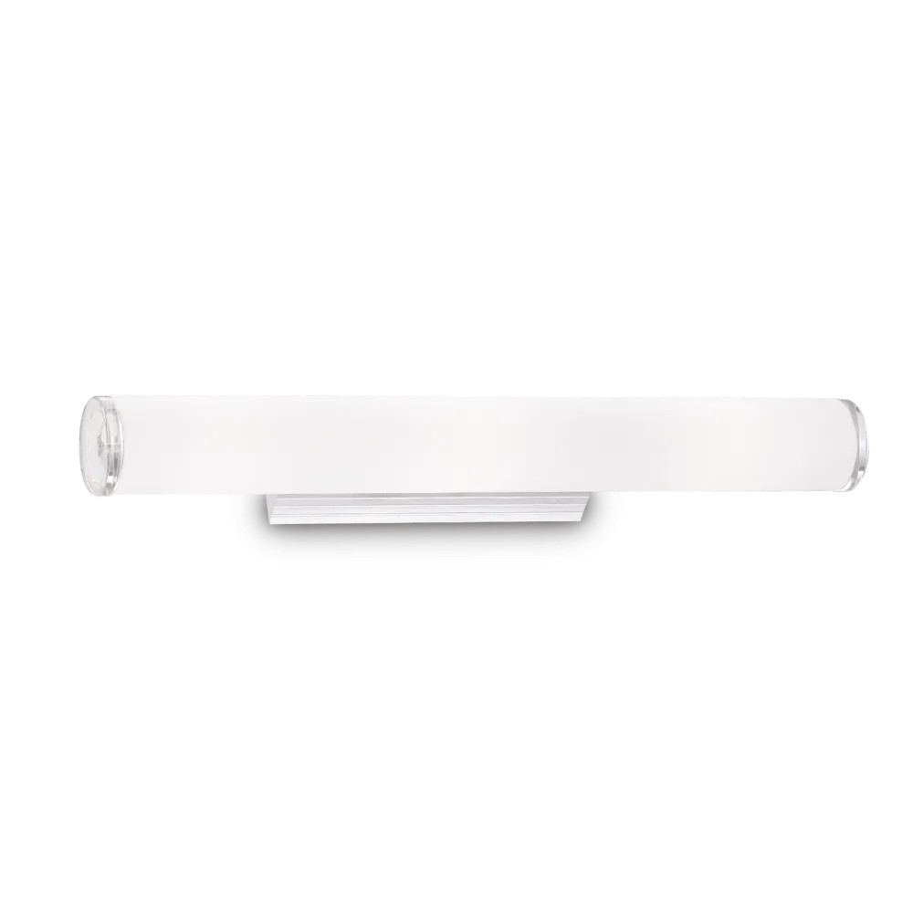 Base in alluminio. Diffusore in vetro bianco soffiato e acidato, chiuso alle estremita' da dischi in materiale acrilico trasparente.