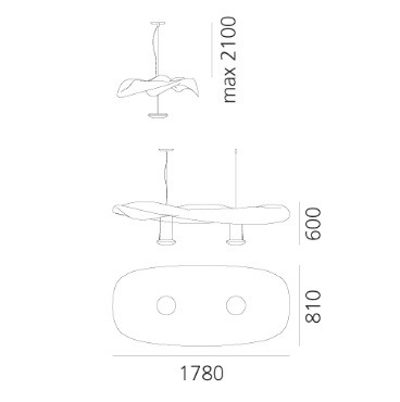 Sono partito dall’idea di congelare un istante che sembra creato dall’aria che scorre su una lamina sottile, ottenendo un flusso e un ritmo molto naturali nel leggero rivestimento scultoreo. Il risultato finale è che l’apparecchio sembra sospeso contro la legge di gravità, su un cuscino d’aria… come il cosmo nelle forme e geometrie complesse che sembrano sfidare ogni spiegazione e creare un senso di infinito.” Materiali: corpo lampada-riflettore in materiale termoplastico. Corpi illuminanti in alluminio pressofuso; diffusore superiore in metacrilato opalino.