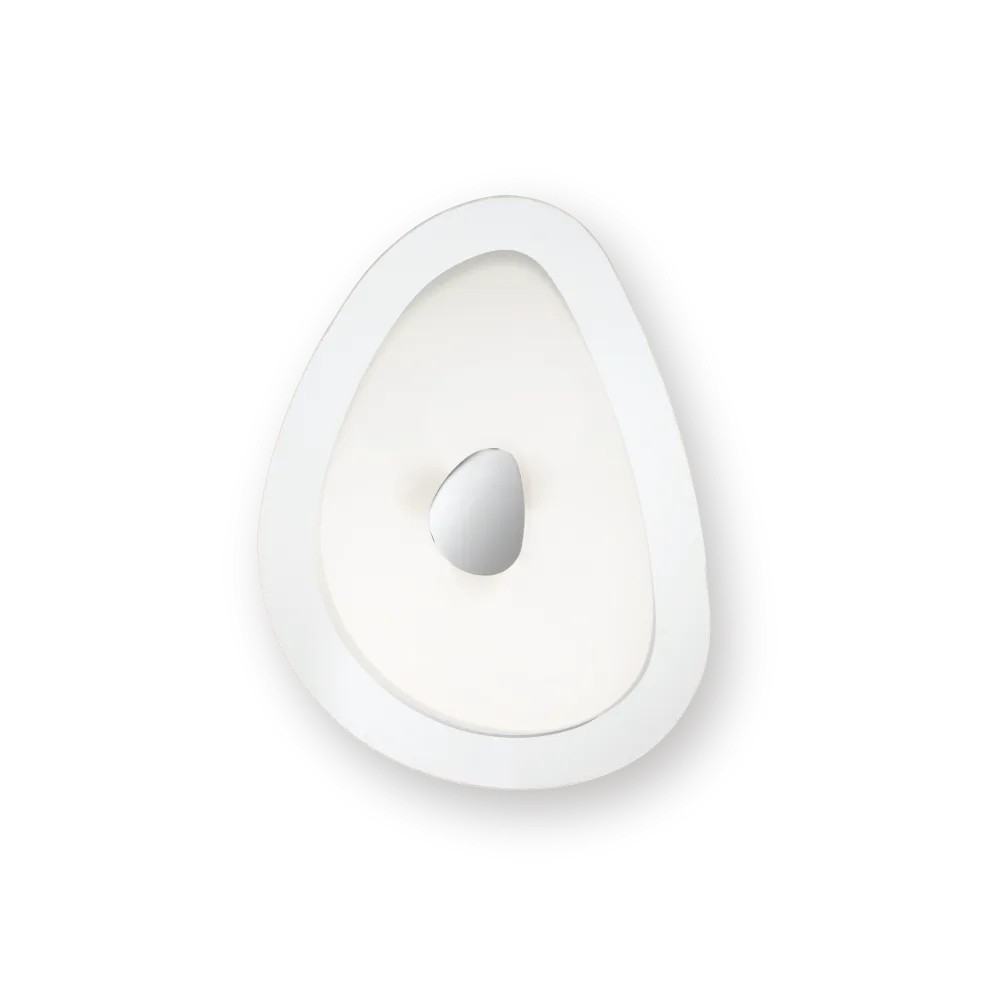 Montatura in metallo smaltato bianco. Diffusore con vetro trasparente serigrafato in bianco. Elemento centrale fissa vetro in metallo cromato.