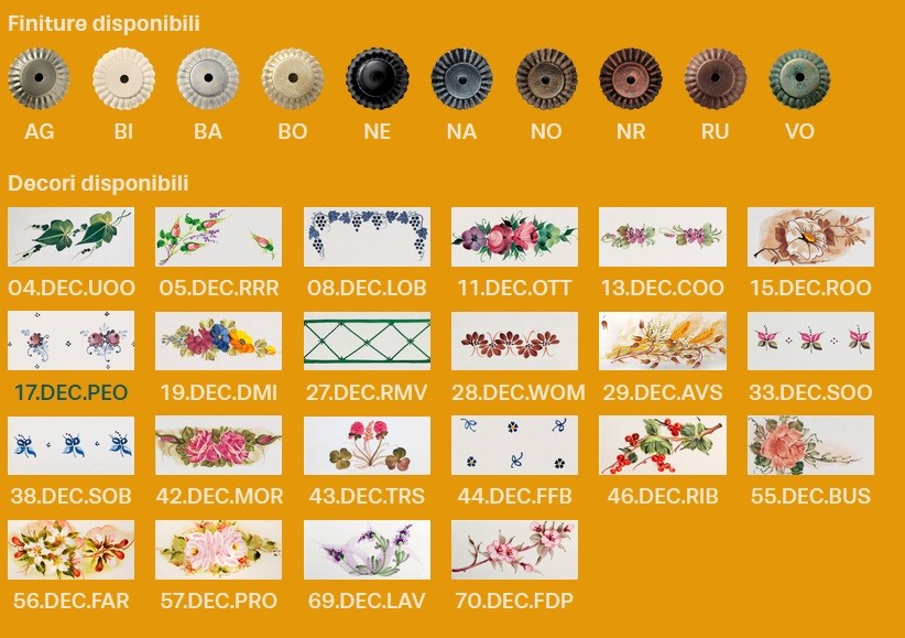 - Finiture disponibili: SCEGLIERE LE FINITURE E I DECORI NELLA TABELLA IN ALLEGATO E SPECIFICARLI AL RIVENDITORE PRIMA DELL'ACQUISTO.