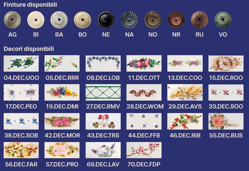- Finiture disponibili: SCEGLIERE LE FINITURE E I DECORI NELLA TABELLA IN ALLEGATO E SPECIFICARLI AL RIVENDITORE PRIMA DELL'ACQUISTO.