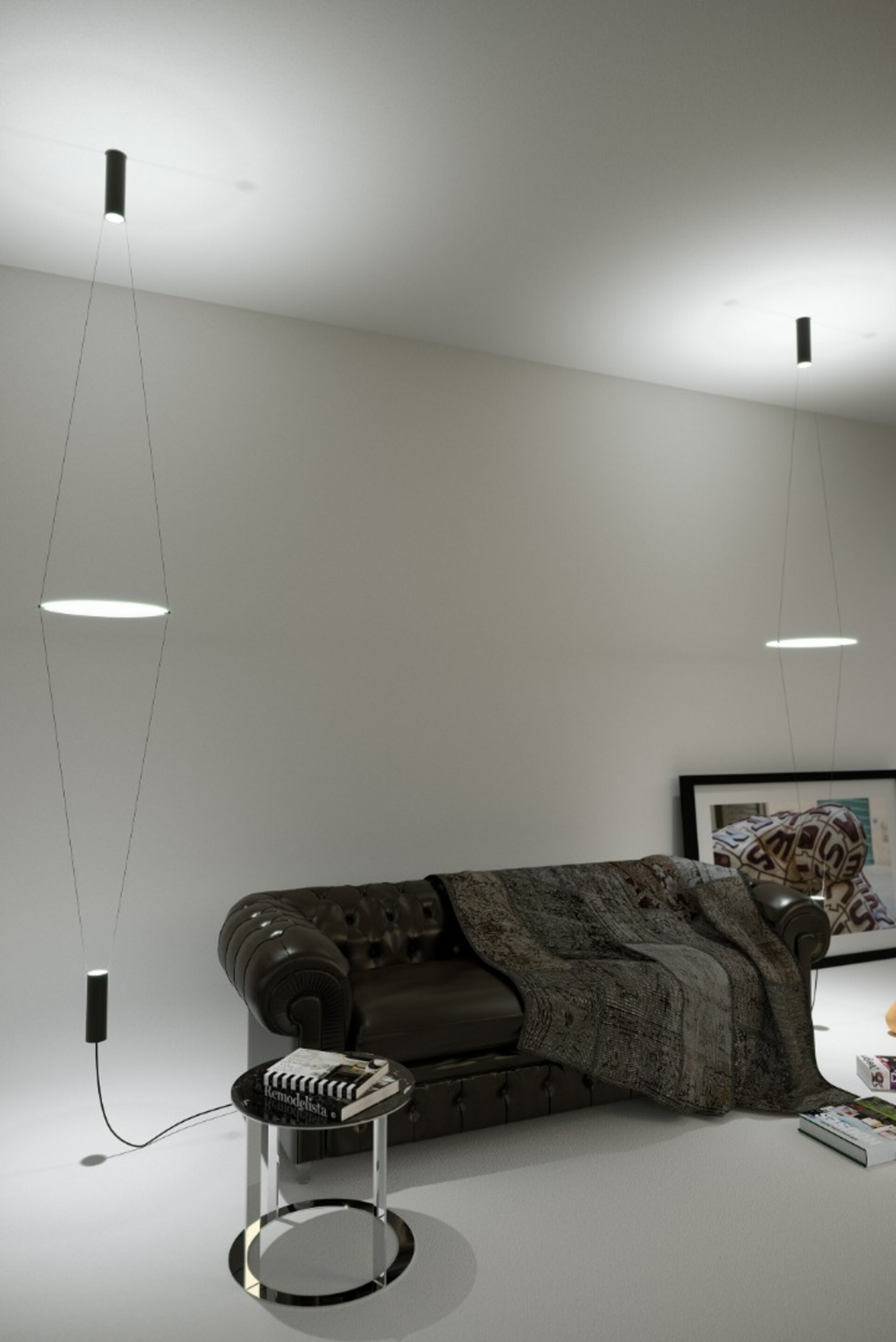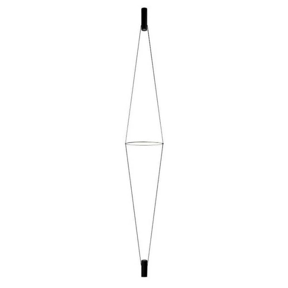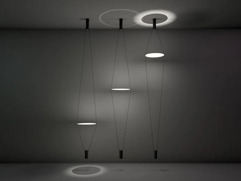 Due cavi conduttori sostengono un disco distanziatore in metacrilato opal bianco, orientabile e aggiustabile in altezza. La luce dei due spot situati alle estremità dei cavi si riflette dal disco sull'ambiente generando morbidi giochi luminosi che puoi variare a tuo piacere. Supporto inferiore completo di cavo con alimentatore elettronico a spina.