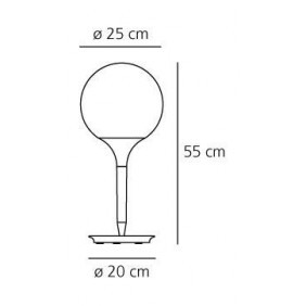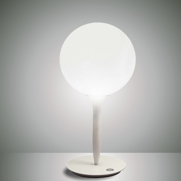 Il design del diffusore sferico viene esaltato dalla presenza di uno stelo luminoso, dalla linea morbida e affusolata, che costituisce il dolce passaggio dalla luce intensa del diffusore alla zona d’ombra della struttura della lampada. Base in zama; stelo in resina termoplastica; diffusore in vetro soffiato.