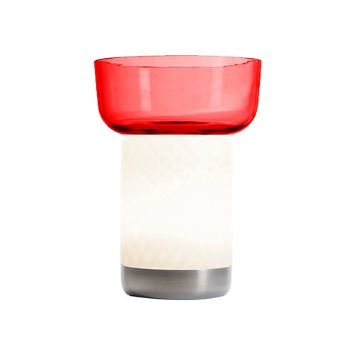 Un corpo in vetro bianco opalino texturizzato diffonde la luce per creare una morbida atmosfera, nel suo incavo superiore si inserisce una ciotola in vetro per accogliere cibi da condividere.