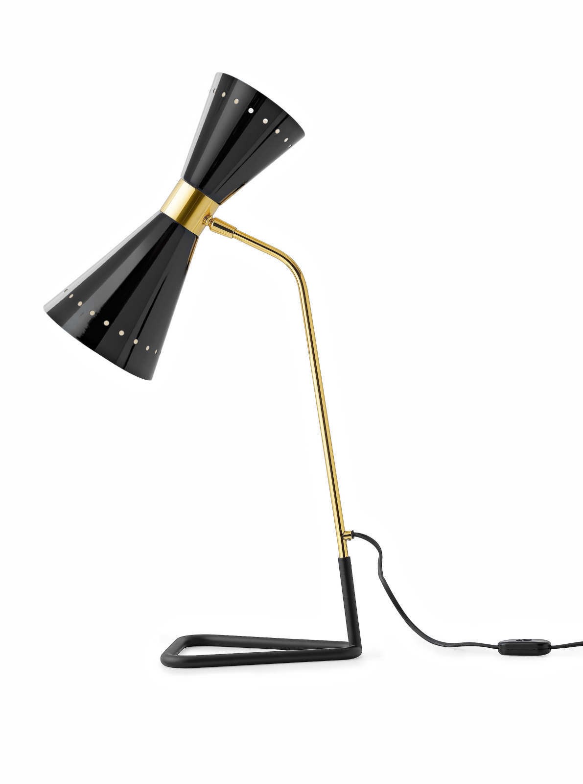 Megafono è una lampada icona degli anni Cinquanta a luce diretta e indiretta. Il paralume orientabile a doppio cono, in finitura avorio o nero lucido, si abbina al prezioso stelo in ottone con doratura galvanica, per illuminare con un tocco raffinato.