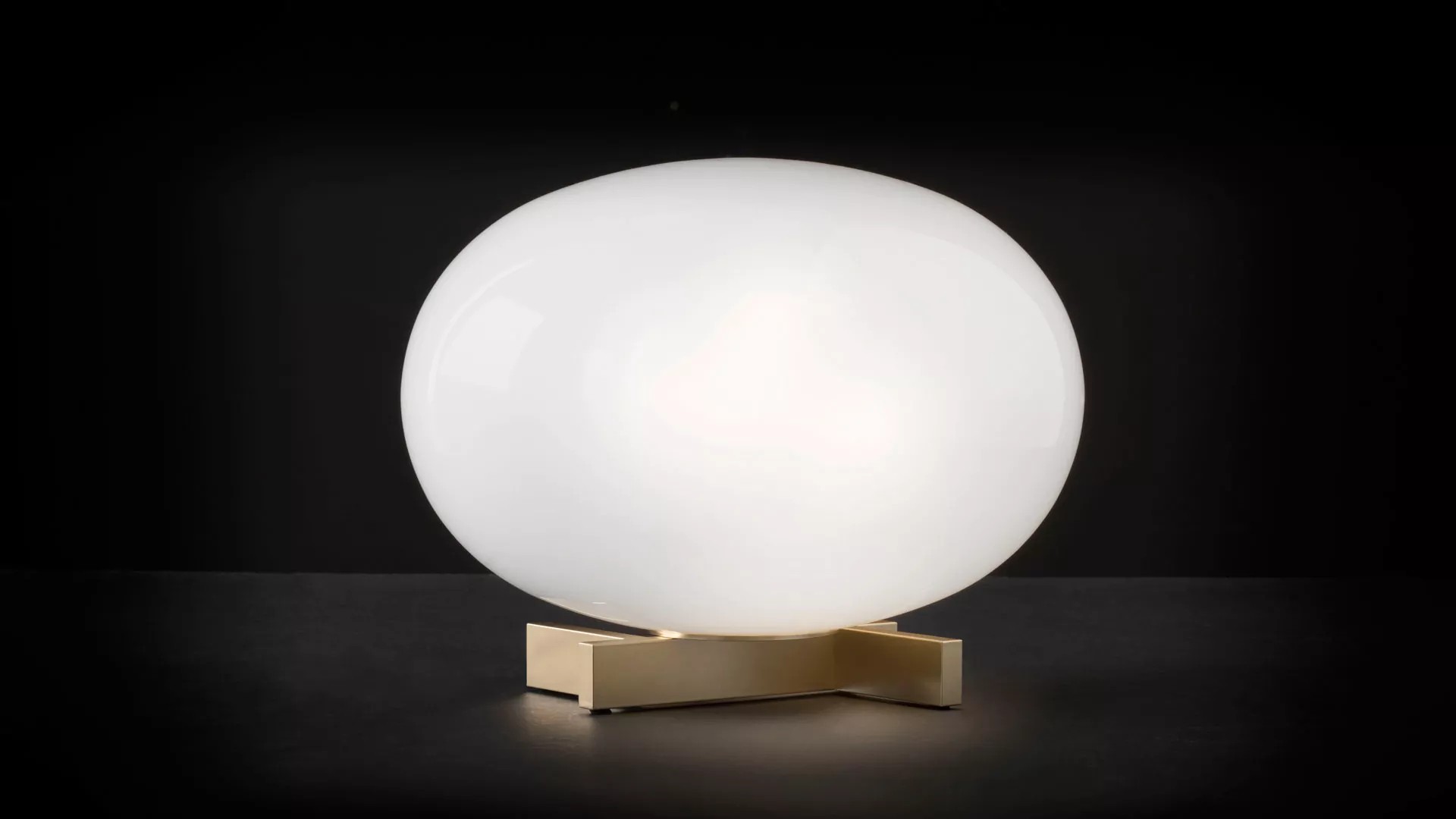 Lampada da tavolo a luce diffusa in vetro soffiato opalino lucido. Struttura in metallo a sezione rettangolare con finitura in ottone satinato. Con dimmer universale.