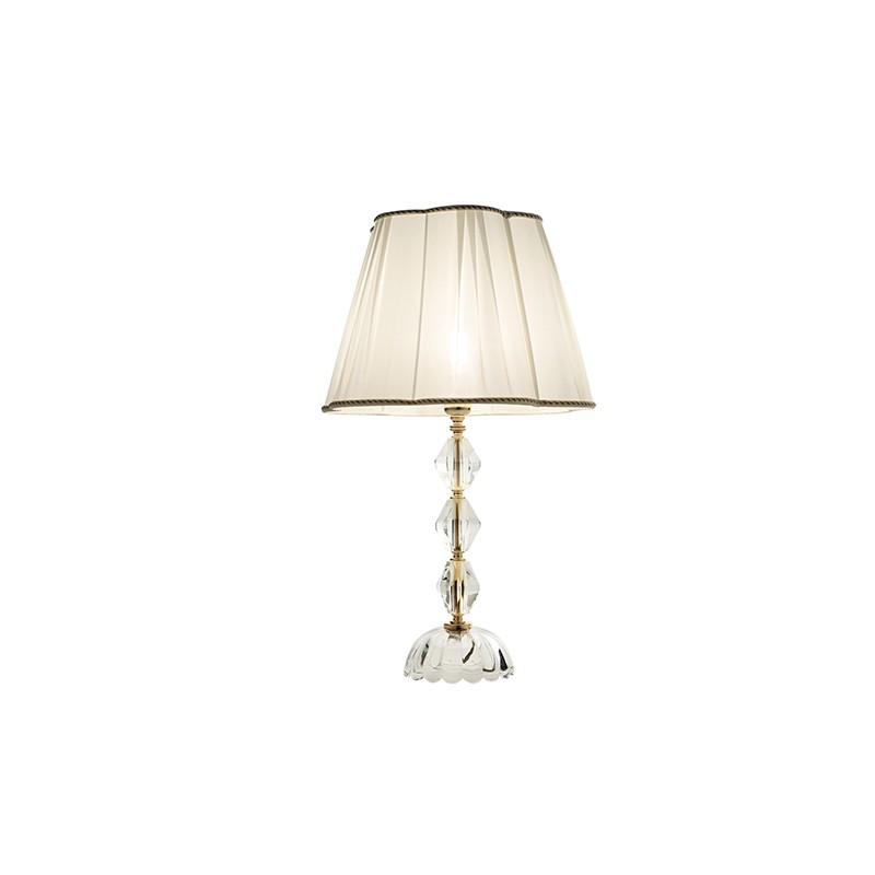 Lampada grande da tavolo, in vetro e cristallo trasparente, metallo finitura oro. Disponibile con paralume in tessuto.