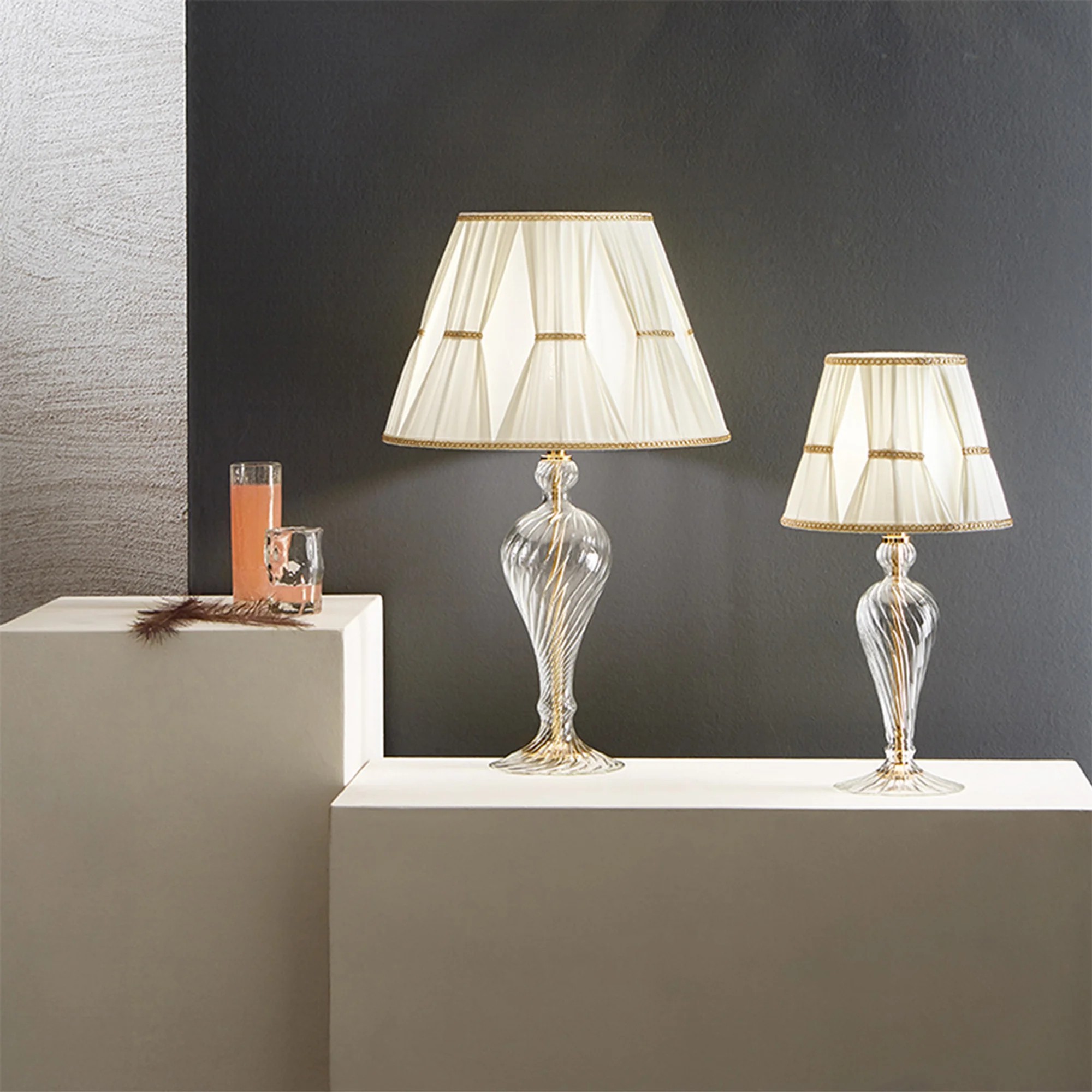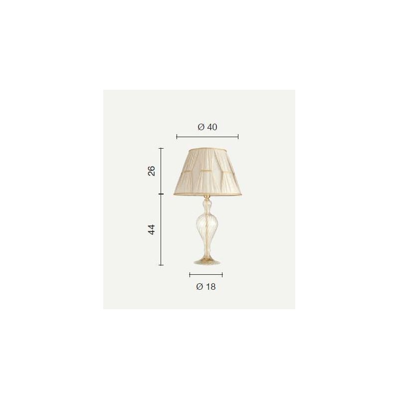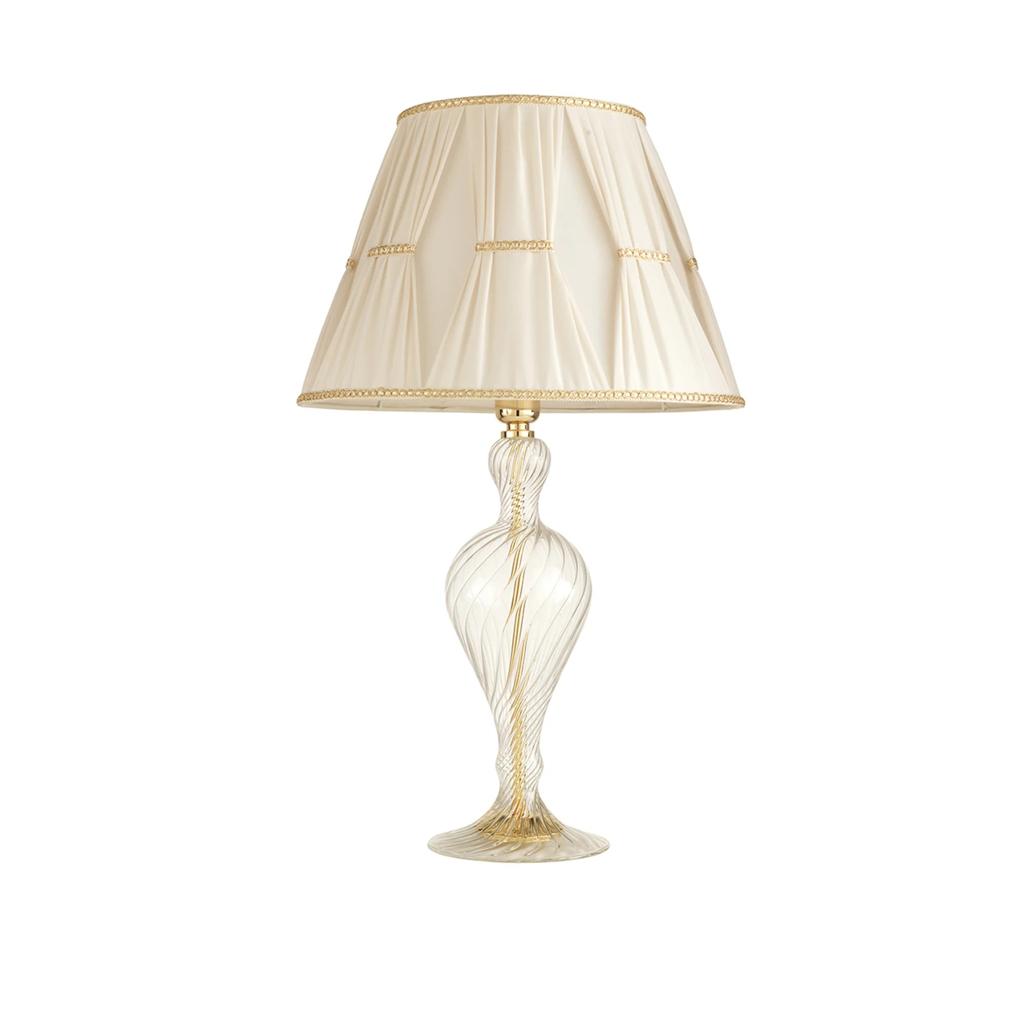 Lampada da tavolo grande in vetro soffiato fatto a mano. Particolari in finitura oro. Disponibile con paralume in tessuto.