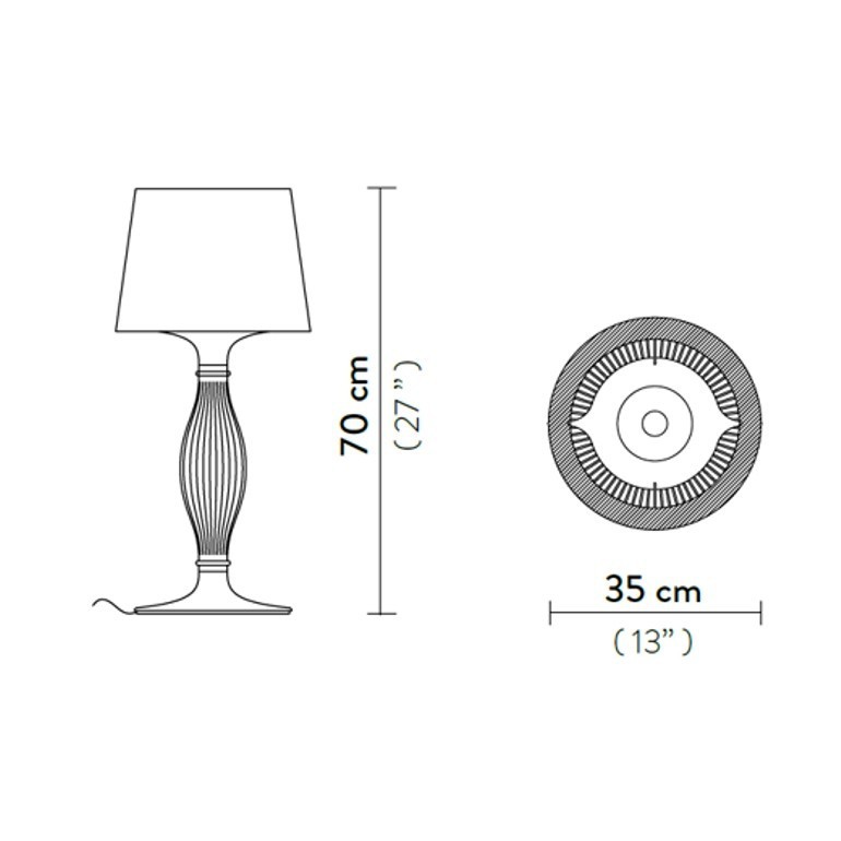 Liza è l’icona a lampada da tavolo di ispirazione barocca che combina un design tradizionale all’innovazione dei tecnopolimeri Slamp. La sua altezza è di 70 cm.