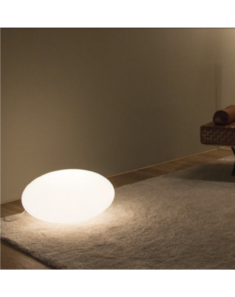 Una lampada da terra dalle generose forme ellittiche. Il diffusore, globo luminoso in polietilene bianco, fluttua dal cavo sorretto da una base in metallo verniciato bianco opaco o in polietilene bianco. Ideale per illuminare ambienti residenziali o di locali pubblici.