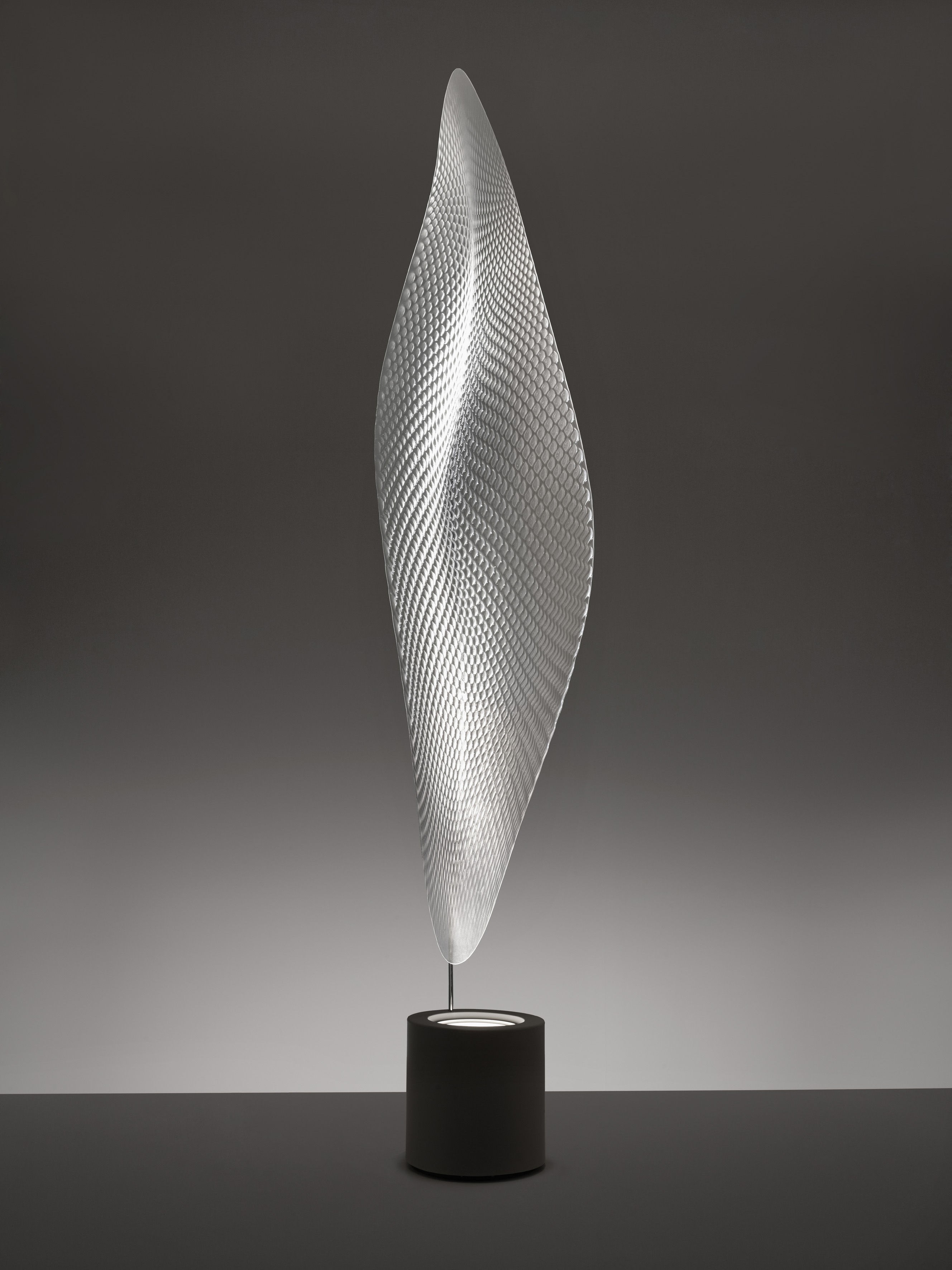 Si presenta come una foglia digitale proveniente da un altro Mondo, ricoperta di squame come un rettile o un insetto che raccoglie luce e ombra sul suo corpo per sedurre la compagna.” Materiali: struttura in acciaio cromato; corpo lampada-diffusore in metacrilato trasparente texturizzato; corpo illuminante in metallo verniciato.