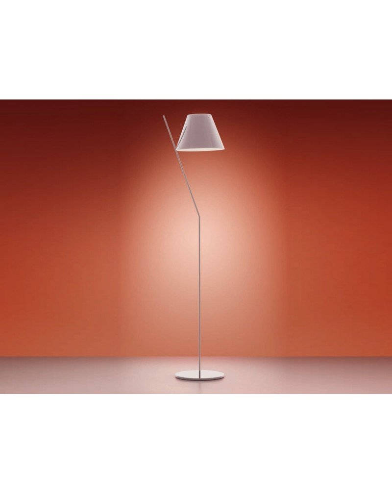 Un archetipo paralume in equilibrio su uno stelo inclinato crea una bilanciata ed elegante composizione geometrica che stupisce pur nella sua semplicità. Il paralume è un leggero volume plastico chiuso da due diffusori che producono una piacevole morbida luce diretta e indiretta. Il giunto sostiene il paralume su un punto di appoggio minimo collegandolo allo stelo in alluminio.