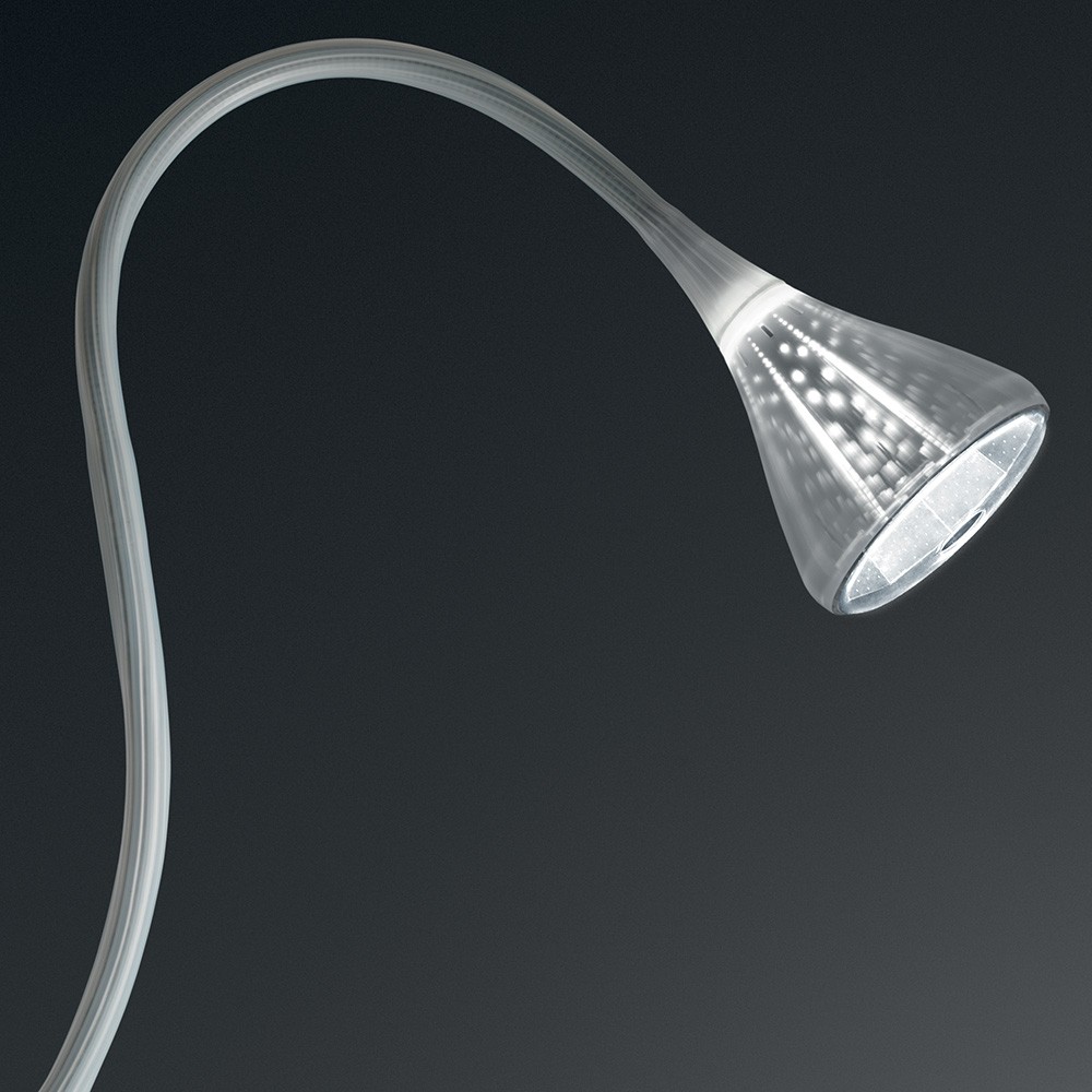 Base in acciaio verniciato effetto “soft touch”; stelo rivestito da una guaina di silicone platinico naturale (anti ingiallimento); diffusore in policarbonato trasparente verniciato effetto gomma; lente trasparente; riflettore interno in alluminio speculare con microforature irregolari.Il nuovo diffusore interno reinterpreta la precedente lampada fluorescente utilizzando una sorgente LED moderna, questo garantisce le stesse prestazioni ottiche con minor consumo di energia e una migliore qualità della luce.