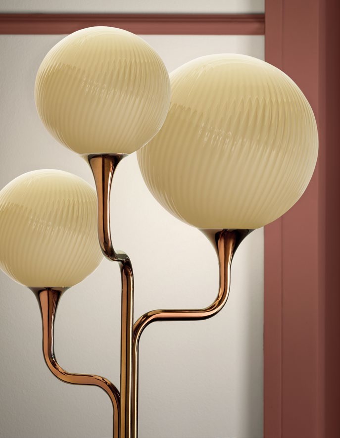 Tee è un esercizio progettuale di ricerca tra rigore geometrico ed eleganza, contrassegnato esteticamente dalla linea curva. Sfere luminose animate da linee che richiamano la natura ondulatoria della luce e raccordate su steli curvati a foggia organica, ricordano la delicatezza del fiore di calla.
